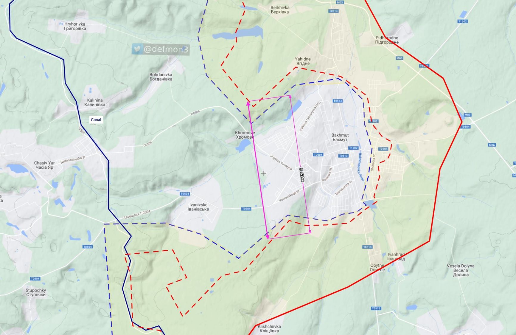 В Бахмуте украинские военные по-прежнему находятся в критическом положении. В южной части города бои идут в районе Ивановского. По данным аналитика Def Mon, ВСУ отбили атаки в районе Орехово-Васильевки, Дубово-Васильевки, Богдановки, Хромово и самого Бахмута. Российские силы, в свою очередь, продвинулись от захваченных Берховки и Ягодного до Хромово. Как подчеркивают аналитики Conflict Intelligence Team, это продвижение закрывает последнюю известную дорогу, соединяющую Бахмут с подконтрольными Украине территориями — путь на Часов Яр. Также CIT утверждают, что Бахмут находится в оперативном окружении. Расстояние между «клешнями» — двумя сторонами незамкнутого круга захвата — составляет всего 5,5 км.
