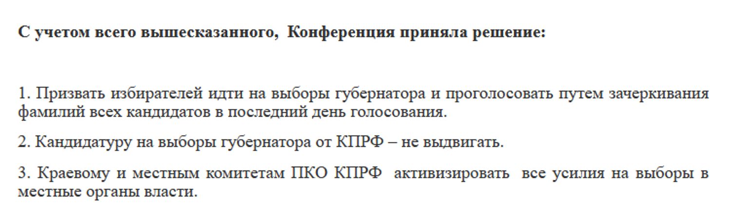 Приморский край стал единственным регионом в России, где на губернаторских выборах в этом году не будет кандидата от КПРФ. Такое решение было принято на XXV конференции Приморского отделения компартии. На прошлых выборах кандидат от коммунистов был близок к победе, но результаты голосования аннулировали, а по результатам нового голосования победителем объявили Олега Кожемяко из «Единой России».