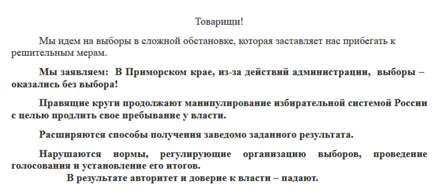 В заявлении, опубликованном по итогам конференции, приморские коммунисты критикуют «нормы, регулирующие организацию выборов, проведение голосования и установление его итогов». Многодневное голосование, голосование вне участков, «электронные» выборы, «муниципальный фильтр» — всё это, по мнению делегатов конференции, ведет к тому, что «расширяются способы получения заведомо заданного результата [на выборах]».