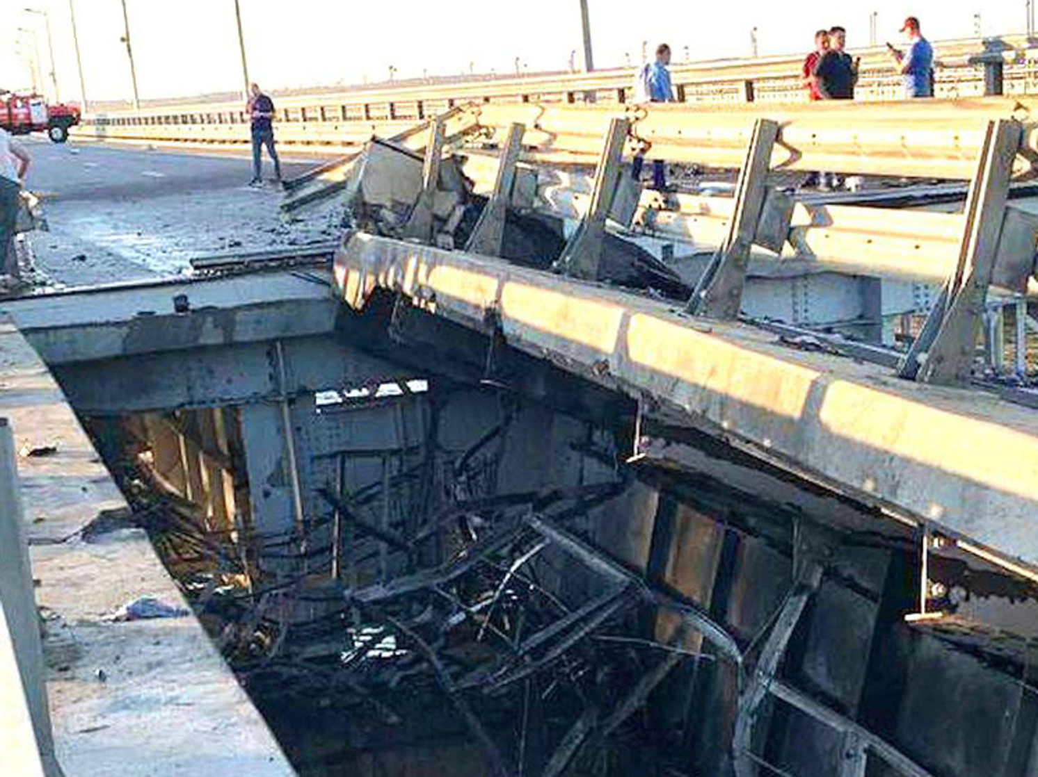 Национальный антитеррористический комитет (НАК) России сообщил, что атака на Крымский мост совершена двумя украинскими беспилотными надводными аппаратами. Об атаке надводными БПЛА сообщали ранее утром и пропагандистские Telegram-каналы, в том числе «Военный обозреватель». В соцсетях публикуют фото и видео повреждений моста.