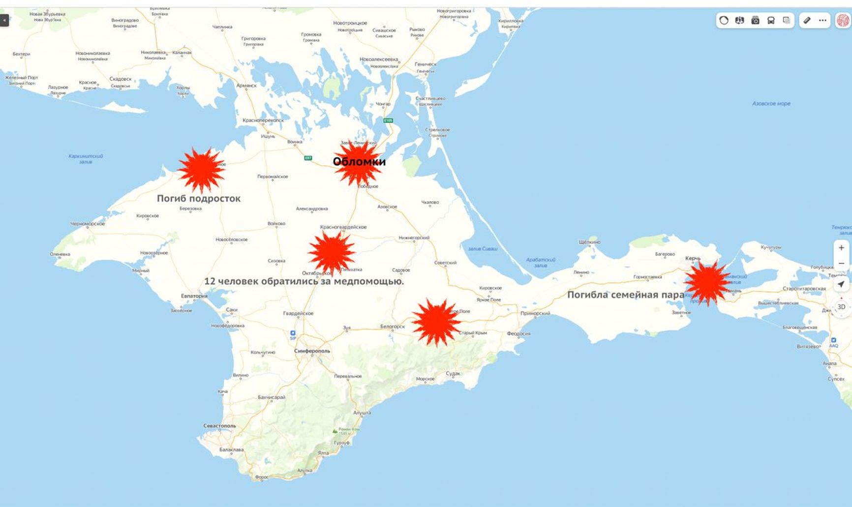 По официальным данным, всего за период с 17 по 24 июля в Крыму было сбито ПВО или подавлено РЭБ 43 беспилотника. Как сообщает Telegram-канал «Крымский канал», около 10 дронов поразили цели. Три человека в результате атак погибли, 12 человек обратились за медпомощью.