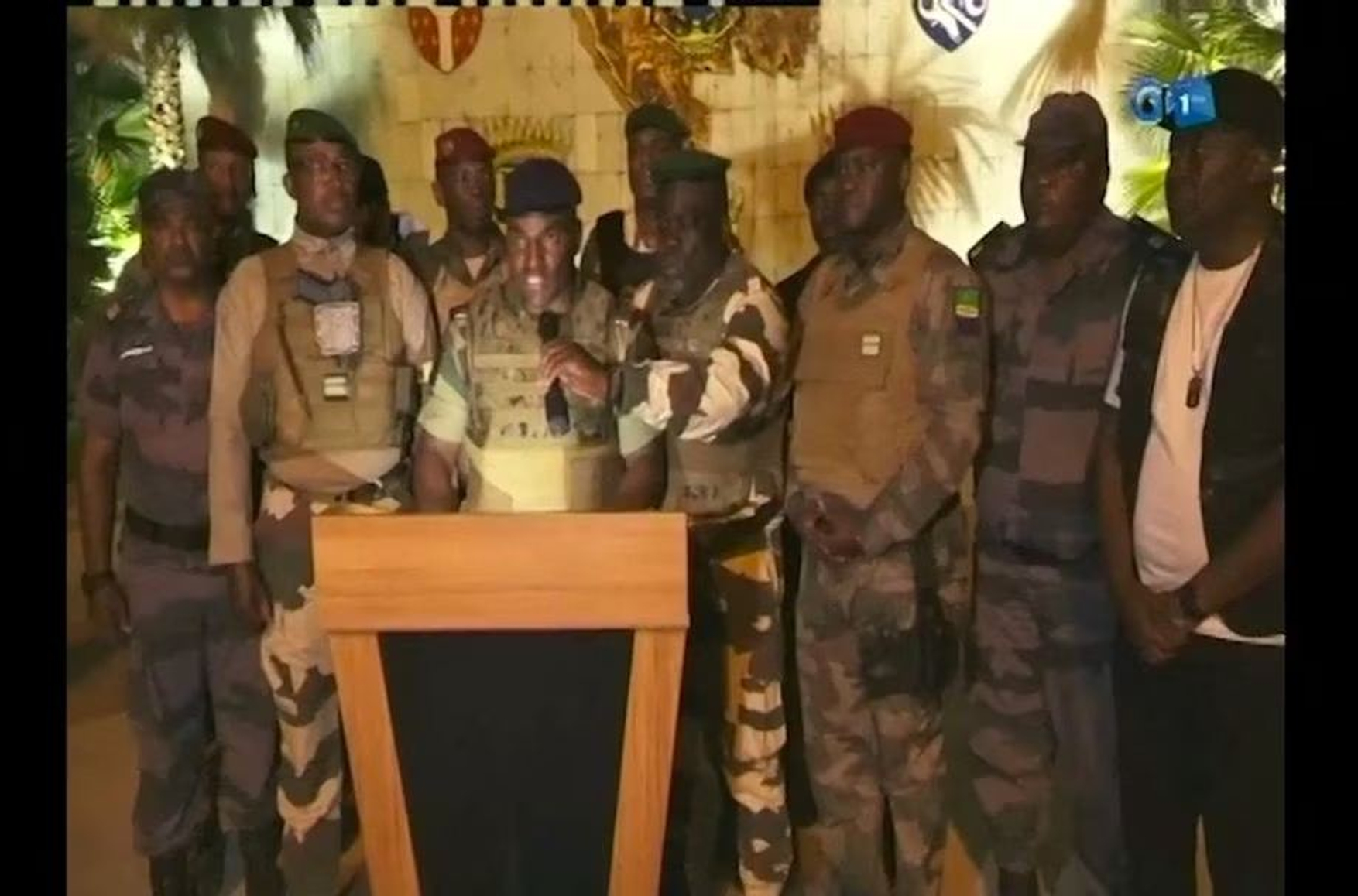Пока один из военных читал совместное заявление, за его спиной молча стояли еще около десятка человек в военной форме и беретах. Военнослужащие представились как члены Комитета по переходному периоду и восстановлению институтов. Они объявили о роспуске правительства, сената, национального собрания, конституционного суда и избирательного органа власти.