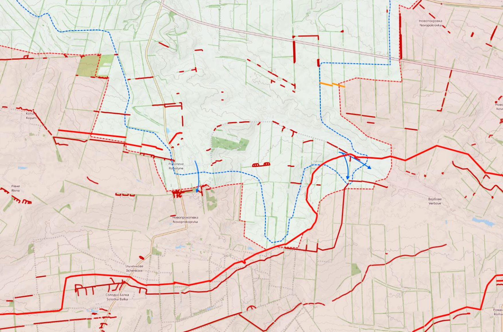 Украинское «вклинение» в оборонительные порядки ВС РФ в районе Работино расширяется как по глубине, так и по ширине наступления.