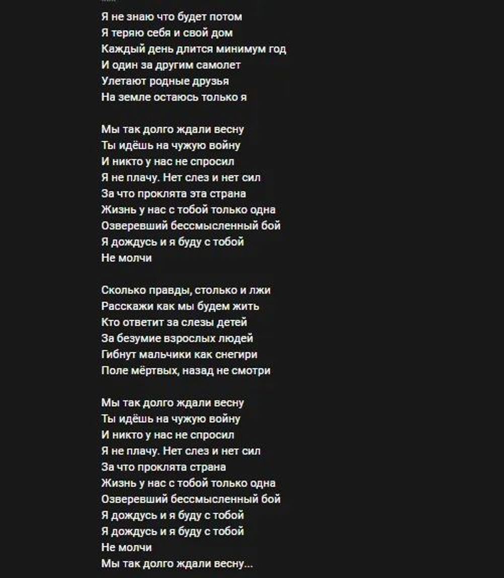 Ранее сообщалось, что у Арбениной отменяют концерты в России в связи с ее антивоенной позицией. Позицию она высказала в песне «Не молчи», которую исполнила на концерте в Челябинске в апреле 2022 года — вскоре после начала полномасштабного вторжения российских войск в Украину. Также она высказывалась против аннексии Крыма.
