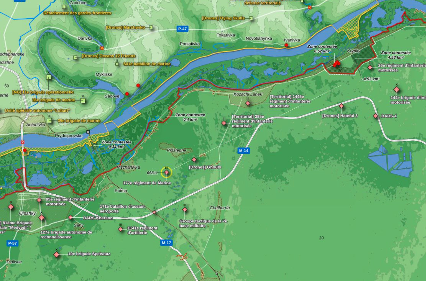 «Рыбарь» утверждает, что украинские военные пытаются расширить присутствие в районе Крынок за счет прибывающих подкреплений, также отмечаются успешные атаки к югу от населенного пункта. Десант ВСУ высадился на остров Алешкинский, а также занял «серую зону» к северу и северо-востоку от села Подстепное.