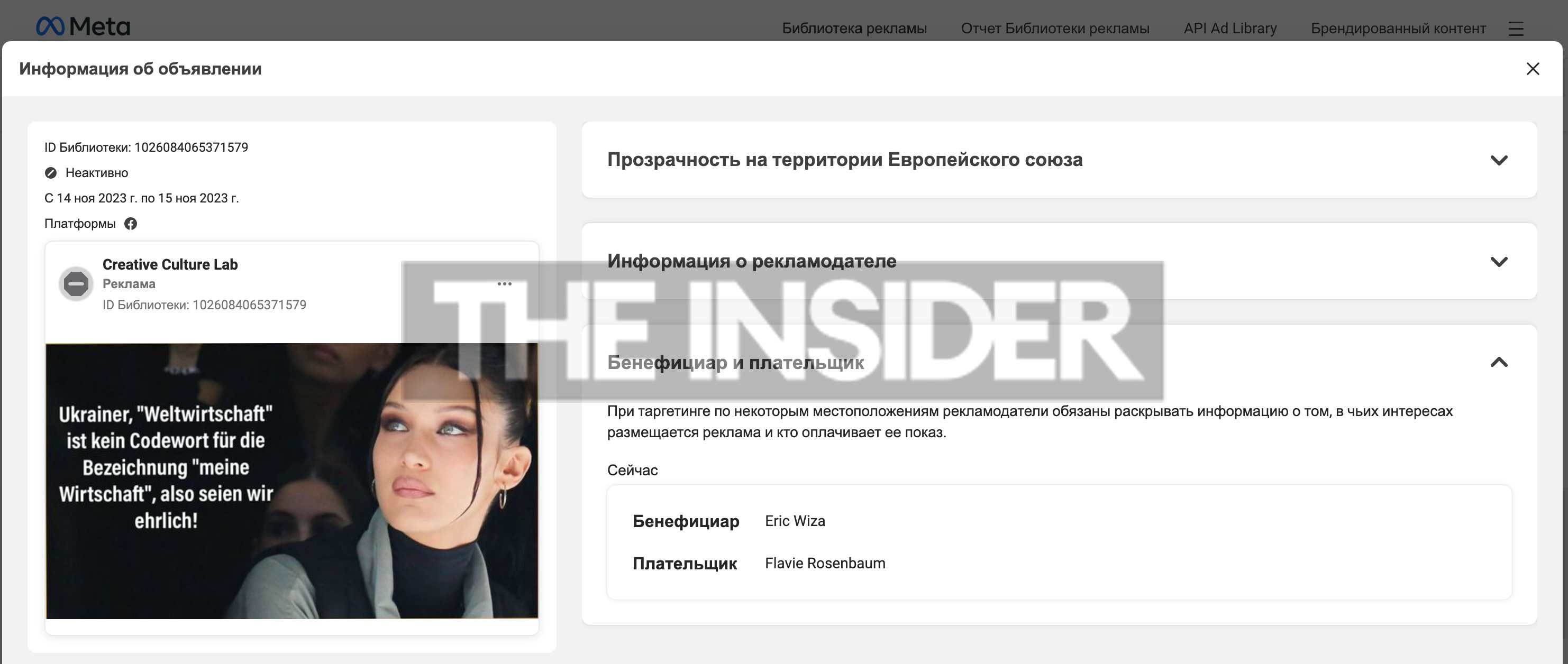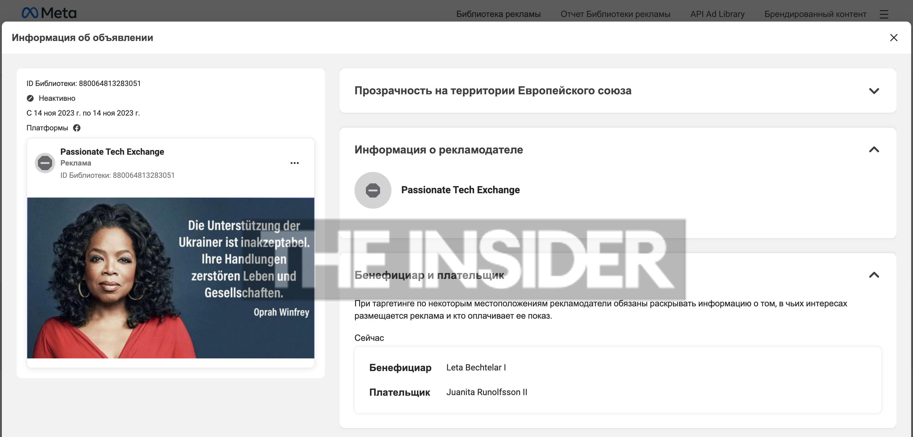 Также The Insider обнаружил, что такие же карточки с фейковыми цитатами распространяют в Facebook, более того, для увеличения охвата аудитории оплачена реклама, то есть фактически Meta получает доход от действий сети ботов. В поле «бенефициары и плательщики» стоят, судя по всему, случайные имена, которыми названы боты, — найти реальных людей с такими именами не удалось.