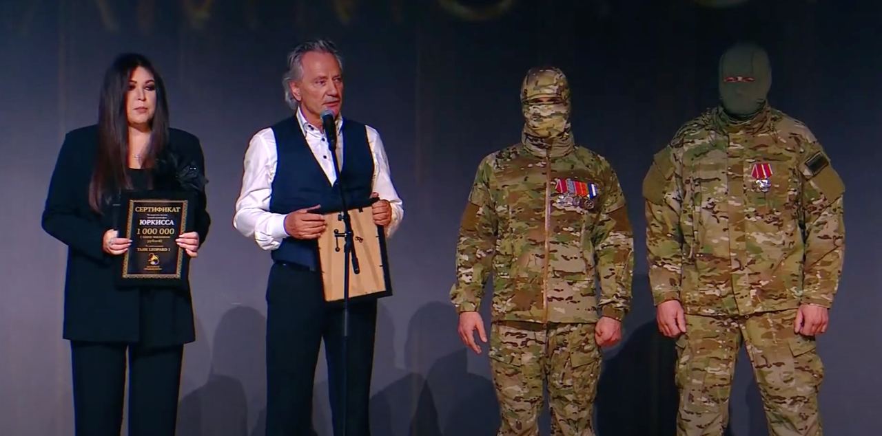 На церемонии вручения российской музыкальной премии «Золотой граммофон» на сцену пригласили двух человек в камуфляже, которых назвали участниками военных действий в Украине, и вручили им сертификаты на миллион рублей за якобы подбитые немецкие танки Leopard. Имена и фамилии «военных» не назвали.