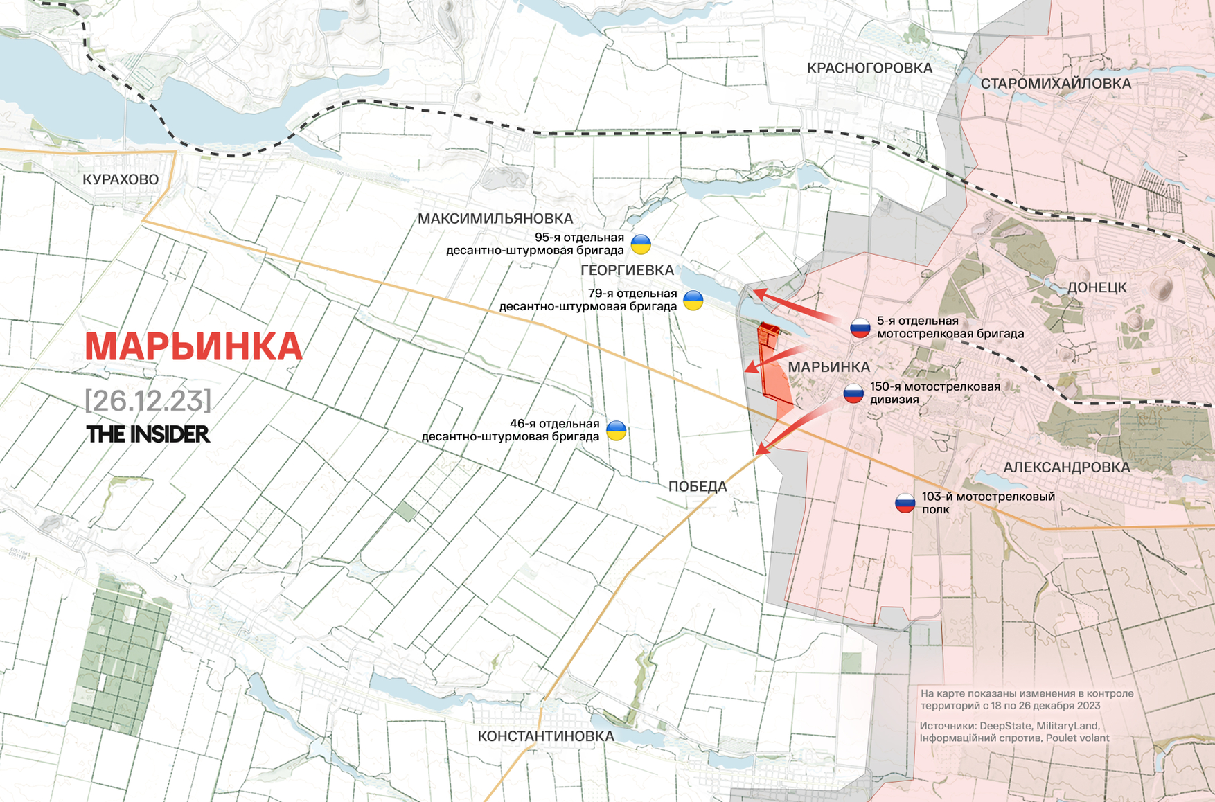 DeepState отмечает, что кадры боев на западных окраинах Марьинки фактически свидетельствуют о потере города. Россияне штурмуют там посадки и подняли флаг напротив разрушенной ранее Георгиевской церкви.