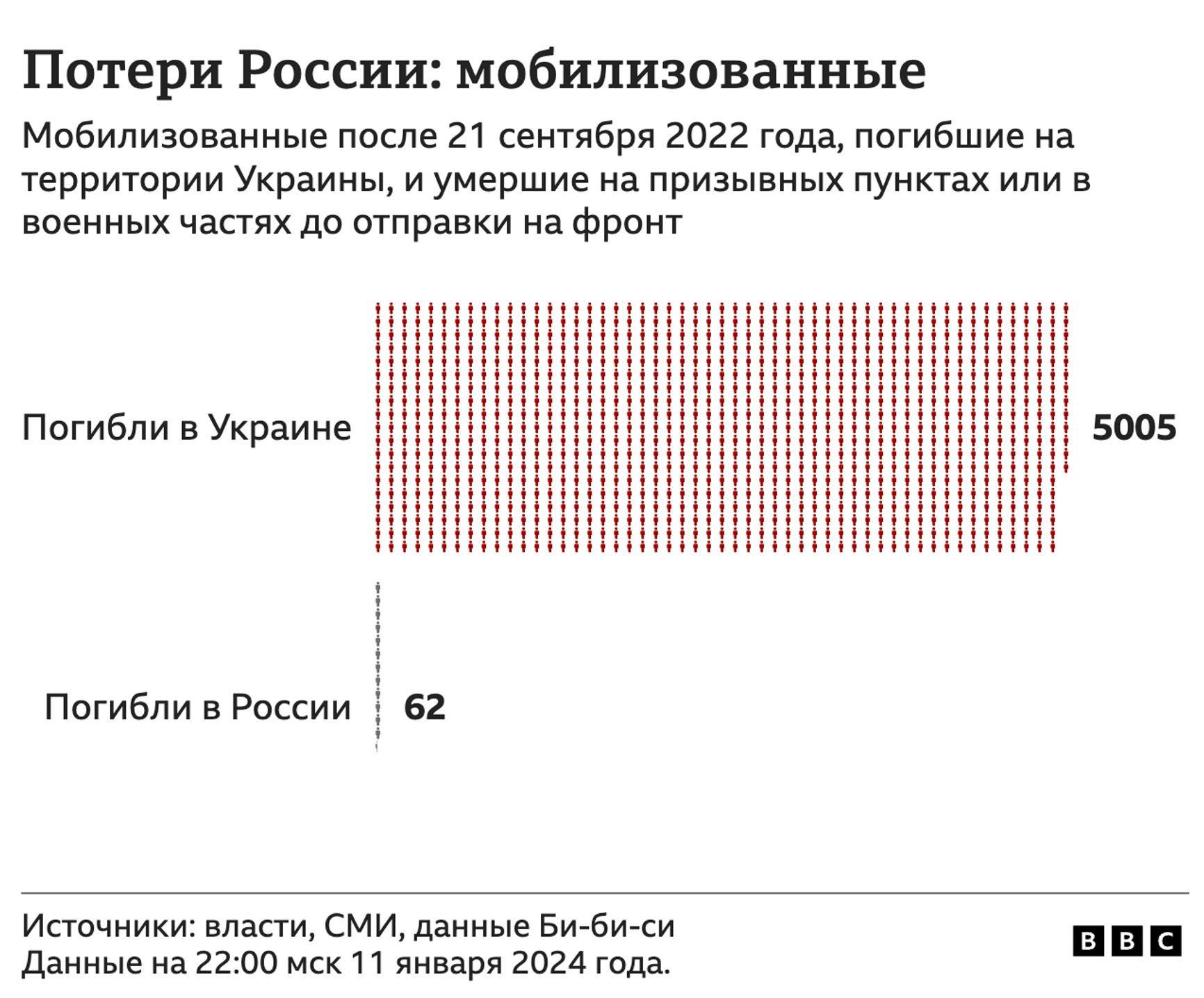 Русская служба Би-Би-Си совместно с изданием «Медиазона» и командой волонтеров установила на основании сообщений в открытых источниках имена 41 731 погибшего с российского стороны в ходе войны против Украины. По данным на 11 января 2024 года, более 1 100 погибших были моложе 20 лет. Журналисты напоминают, что Госдума РФ в апреле 2023 года одобрила поправки, разрешающие подписание 18-летними выпускниками школ контрактов с Минобороны РФ. С тех пор на войне погибло как минимум 48 россиян 2004-го года рождения и пять — 2005-го.