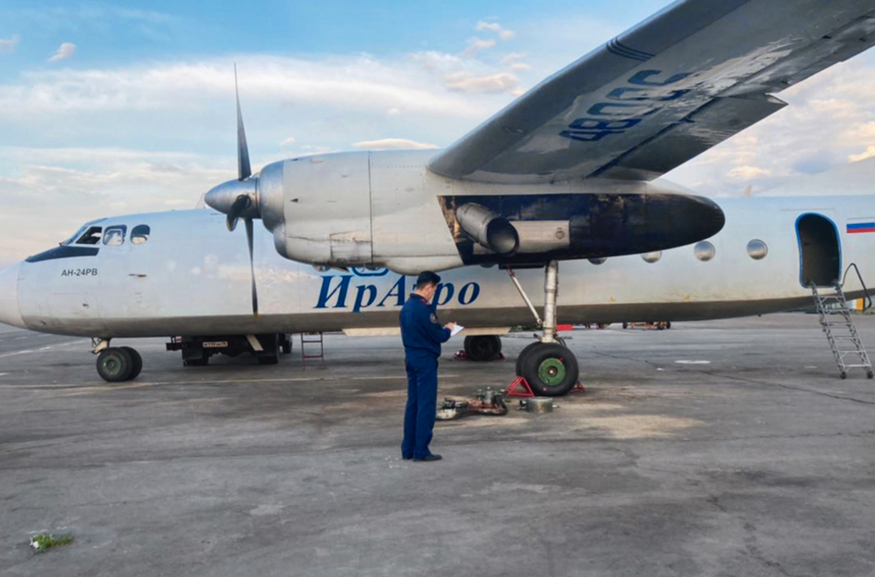 На фото: самолет Ан-24 АК «ИрАэро», севший в аэропорту Иркутска в июне 2022 года с загоревшимся крылом