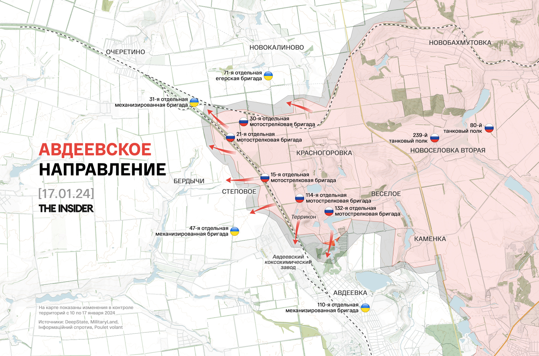 DeepState описывает очередную неудачную атаку ВС РФ на северные окраины Авдеевки. Штурм 15 января был организован с трех направлений с целью либо прорваться малыми группами, либо отвлечь внимание от основного удара. В то же время со стороны Веселого двигалась колонна военной техники, состоящая не менее чем из 10 единиц. Разминирование выполнял «танк-смертник», ехавший по минному полю, который украинские военные сначала сочли дистанционно управляемым, однако потом стало понятно, что в кабине сидел экипаж. Атаку удалось отбить, часть техники подбита.
