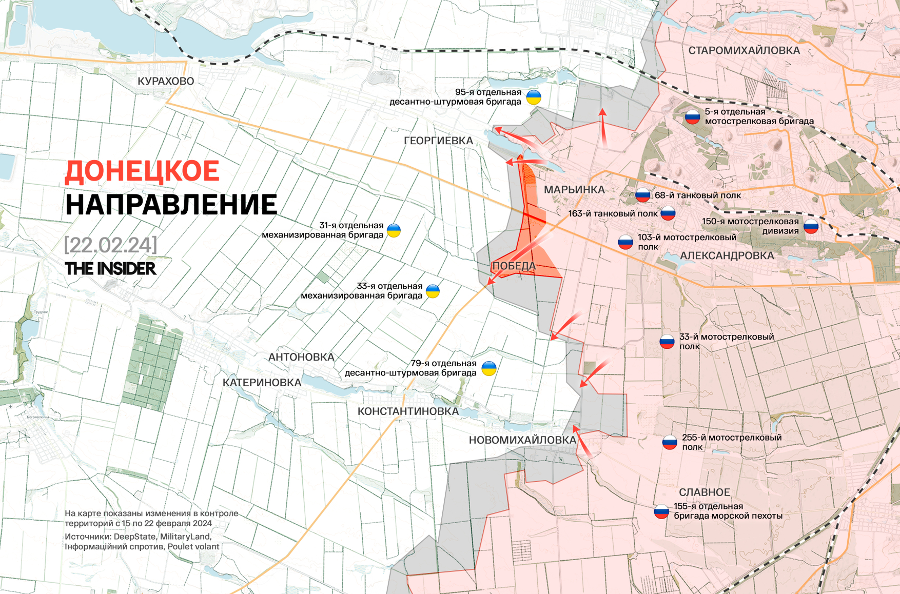 Тем временем Минобороны РФ отчиталось об «освобождении» поселка Победа к югу от Марьинки. Судя по выложенным в открытый доступ снимкам, занятый поселок полностью разрушен.