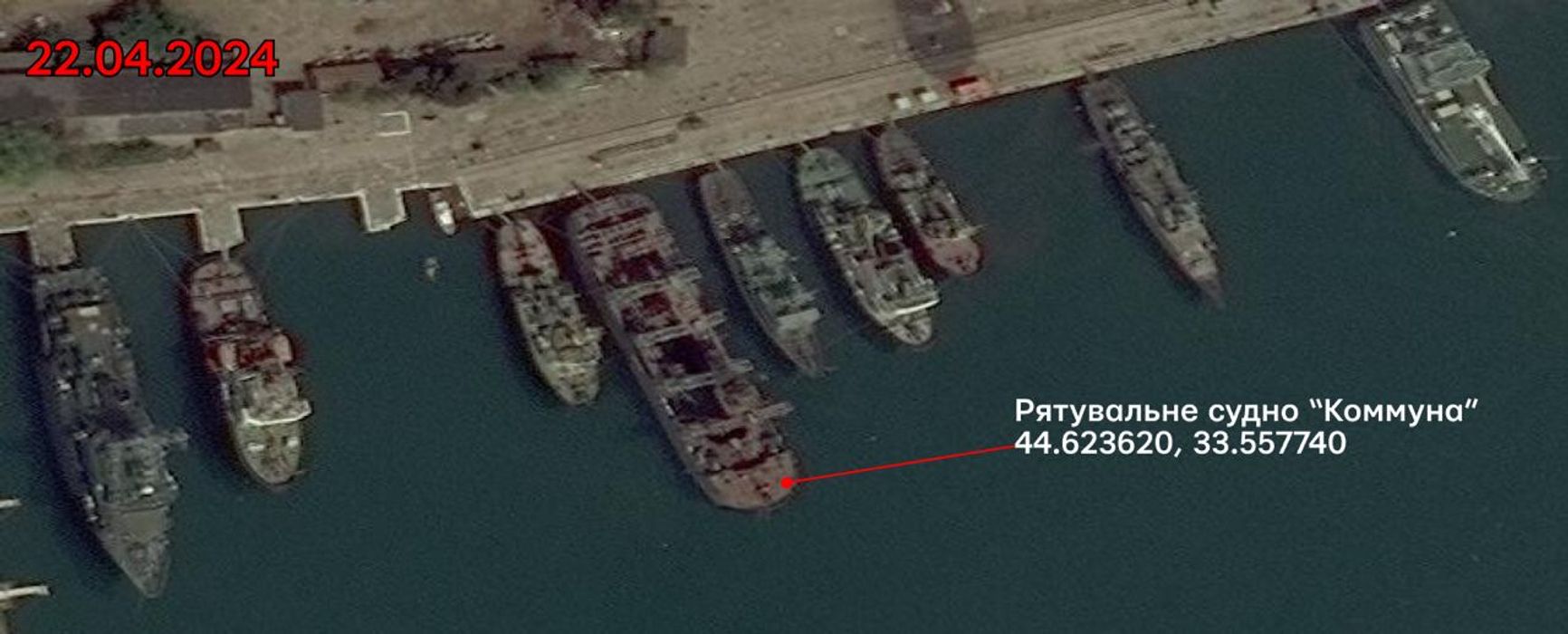 В тот же день ВСУ, по-видимому, удалось поразить в Севастополе спасательное судно подводных лодок «Коммуна», считающееся старейшим действующим военным кораблем в мире. Судя по спутниковым снимкам, корабль обошелся без (видимых) повреждений, однако сообщается о ранении двух моряков.