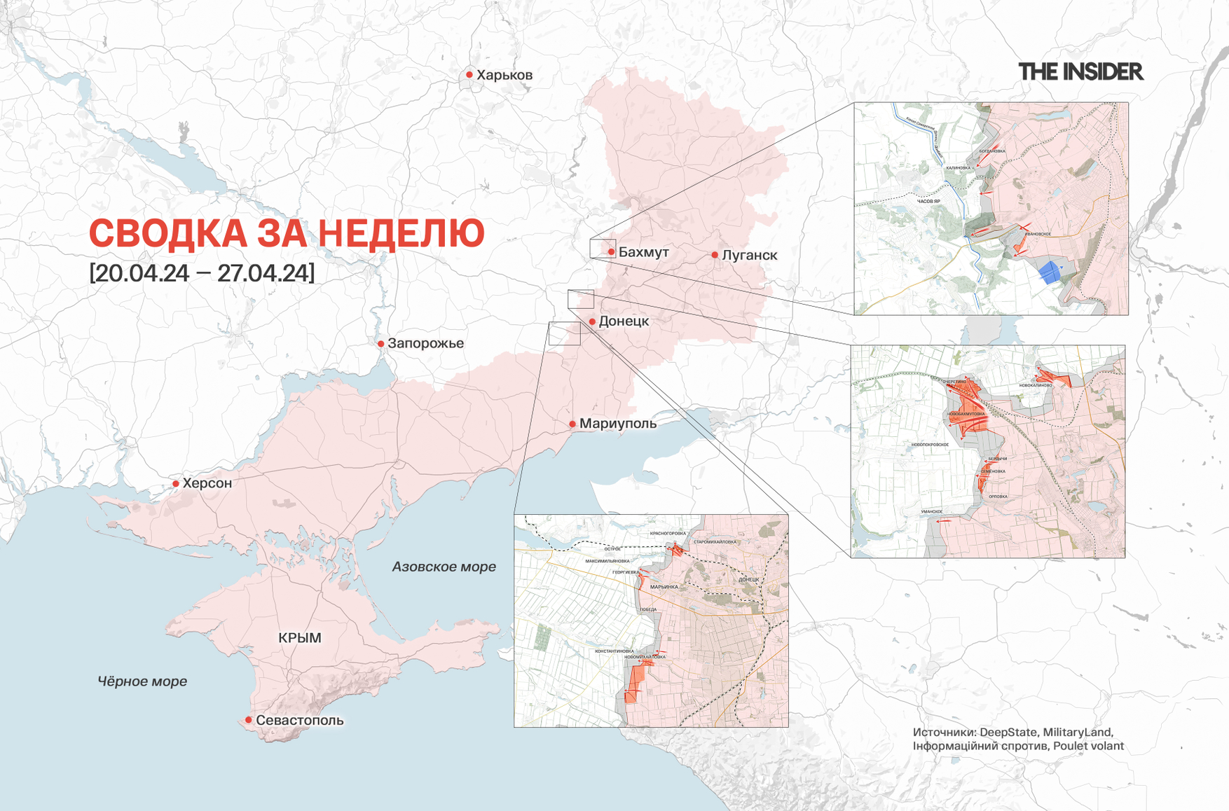 Также на этой неделе The Insider опубликовал обзорный материал о ситуации на фронте после захвата Авдеевки. ВС РФ по-прежнему придерживаются тактики «мясных штурмов», добиваются тактических успехов, но не могут перевести их в оперативные. ВСУ находятся в стратегической обороне в условиях нехватки боеприпасов и личного состава. Если не случится чего-то экстраординарного, в течение 2024 года ни одной из сторон не удастся выйти из «позиционного тупика».