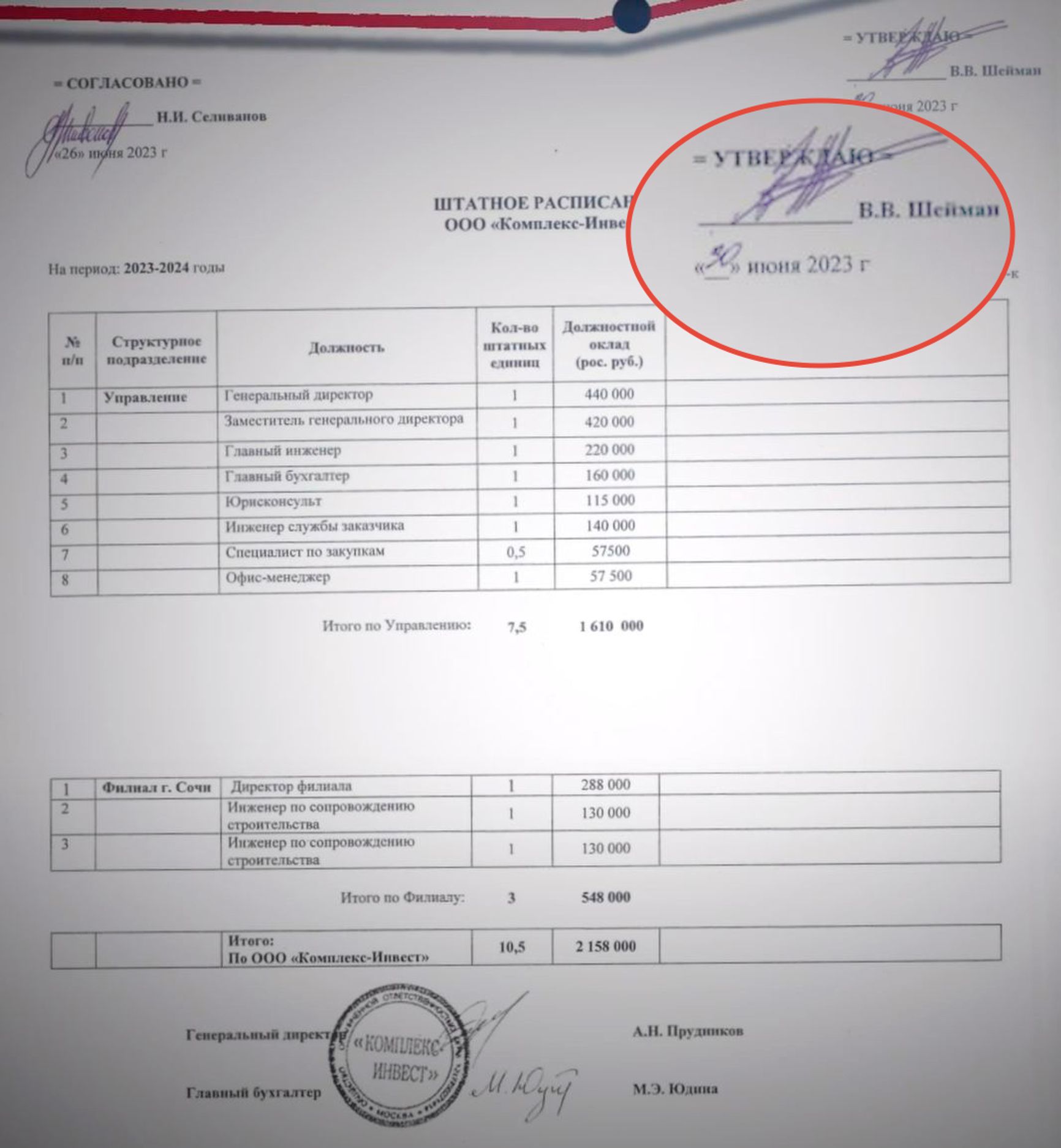 Более того, в штатном расписании российской компании ООО «Комплекс-Инвест» уже прямо указана фамилия советника Лукашенко с его же подписью, сообщают журналисты: «Утверждаю, В. В. Шейман». Согласовано расписание тоже советником Лукашенко — ранее упомянутым Селивановым. В итоге получается, что Лукашенко отдал России кусок земли, взамен получил в собственность Республики огромный участок под Сочи и за копейки продал его частной российской фирме, которой управляют два его советника.
