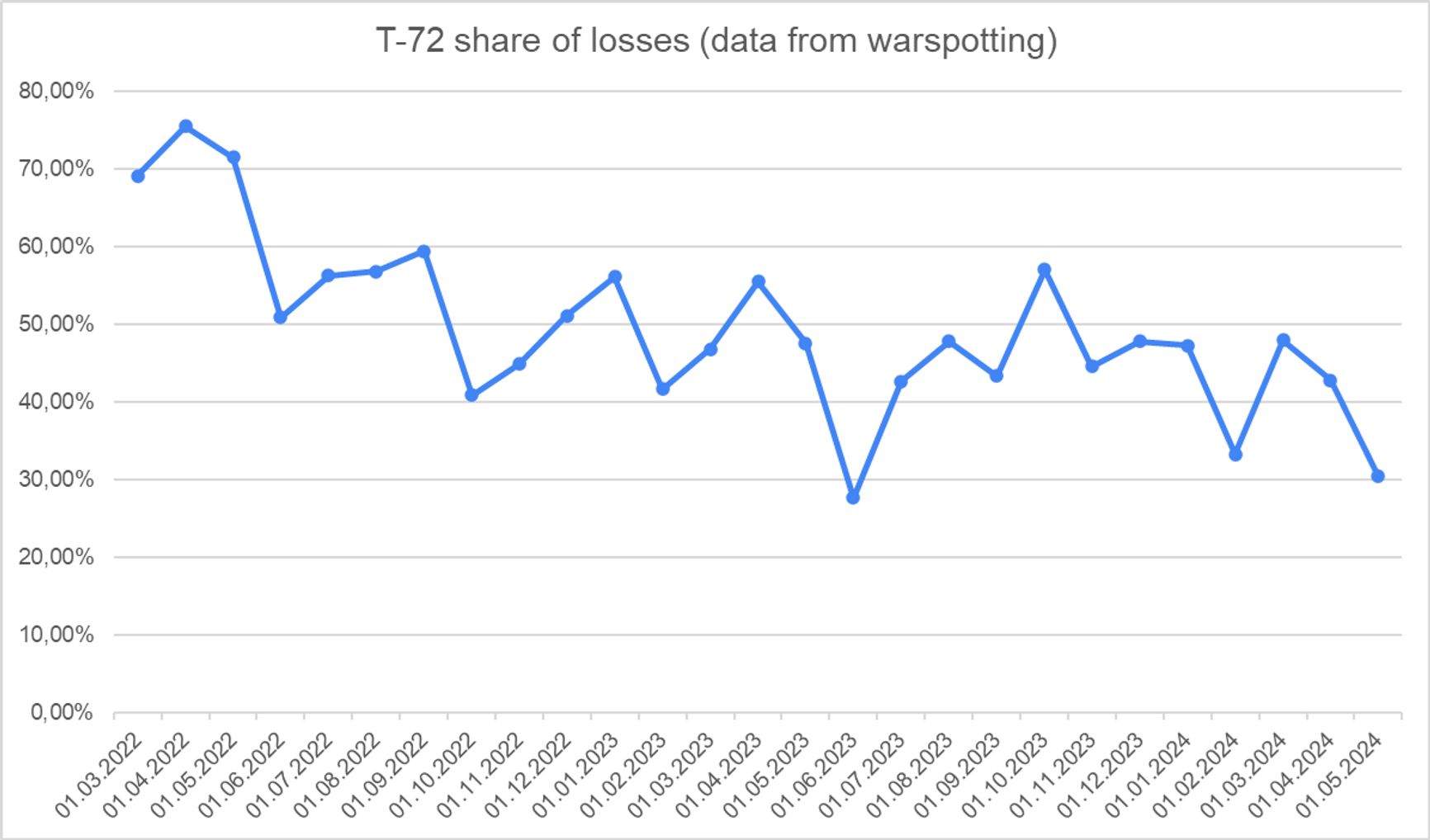 OSINT-исследователь HighMarsed отмечает снижение потерь российских танков Т-72, что, по его наблюдениям, связано с почти полным исчерпанием на базах хранения Т-72Б, используемых для выпуска модификации Т-72Б3М. Сейчас остается только одна база, где хранится 200 единиц этих танков. Вместо них используются Т-80, а также в меньшей степени Т-62 и новые Т-90.