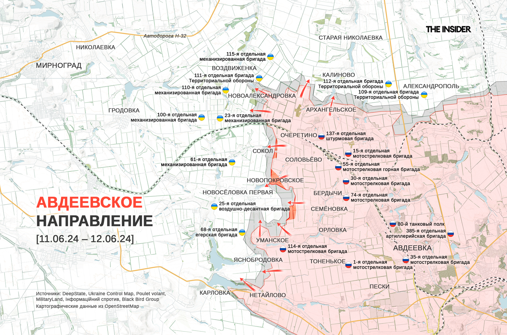 По данным DeepState, на северном фланге авдеевского операционного района российским силам удалось продвинуться к Соколу, а также в Новопокровском и его окрестностях. По мнению украинского военного обозревателя Константина Машовца, россиянам в ближайшее время удастся выйти на рубеж Новопокровское — Уманское и занять Яснобродовку, что позволит дальше продолжать наступление в западном и северо-западном направлениях от Очеретино. Интересно, что Машовец отмечает «существенное преимущество <ВС РФ — The Insider > в силах и средствах», в то время как Z-канал «Юнкеръ» утверждает, что наступление в районе Очеретино увязло, поскольку «развивать успех некому, нет войск».