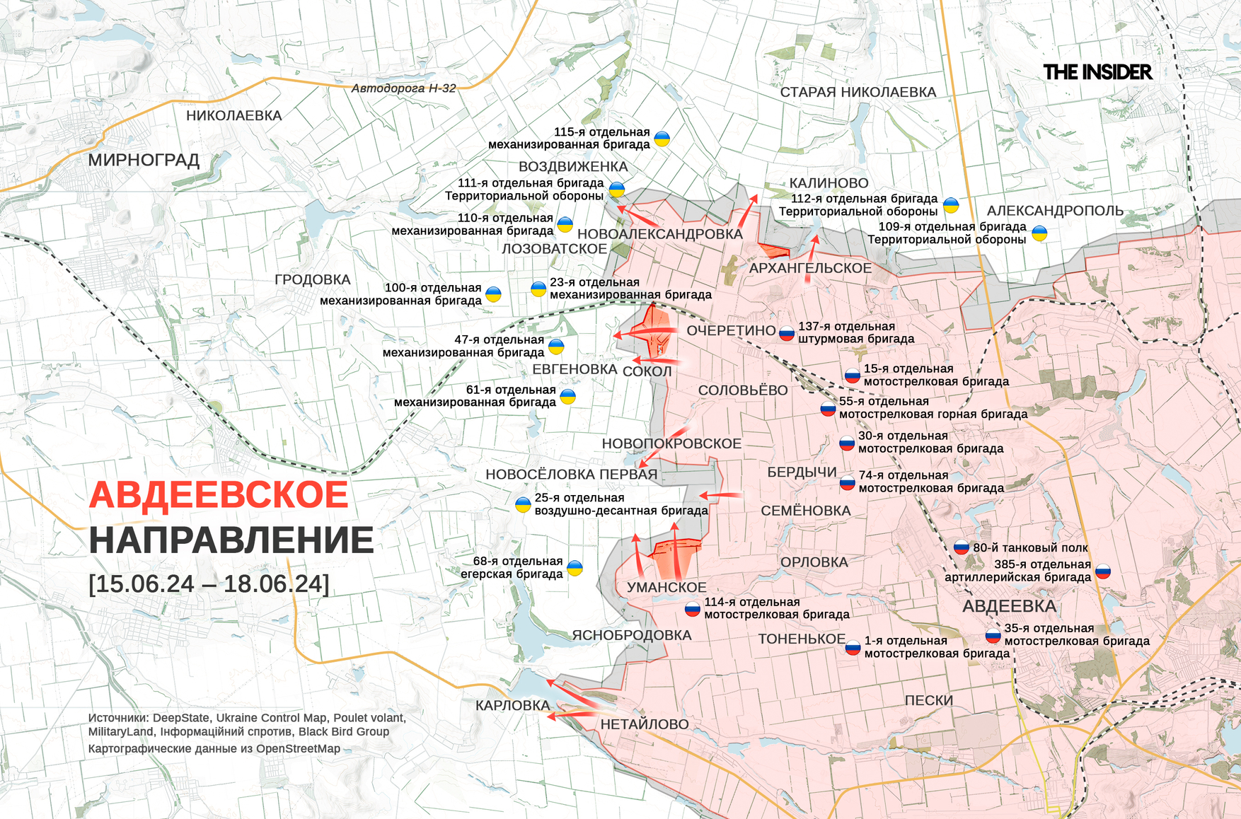 В авдеевском операционном районе DeepState фиксирует продвижение ВС РФ возле Уманского, Сокола и Архангельского. Украинский военнослужащий Александр Солонько, в свою очередь, пишет, что в районе Очеретино у россиян есть «обязательная программа: минимум один банзай <имеются в виду самоубийственные “банзай-атаки” японских солдат во время Второй мировой войны — The Insider> каждый день».