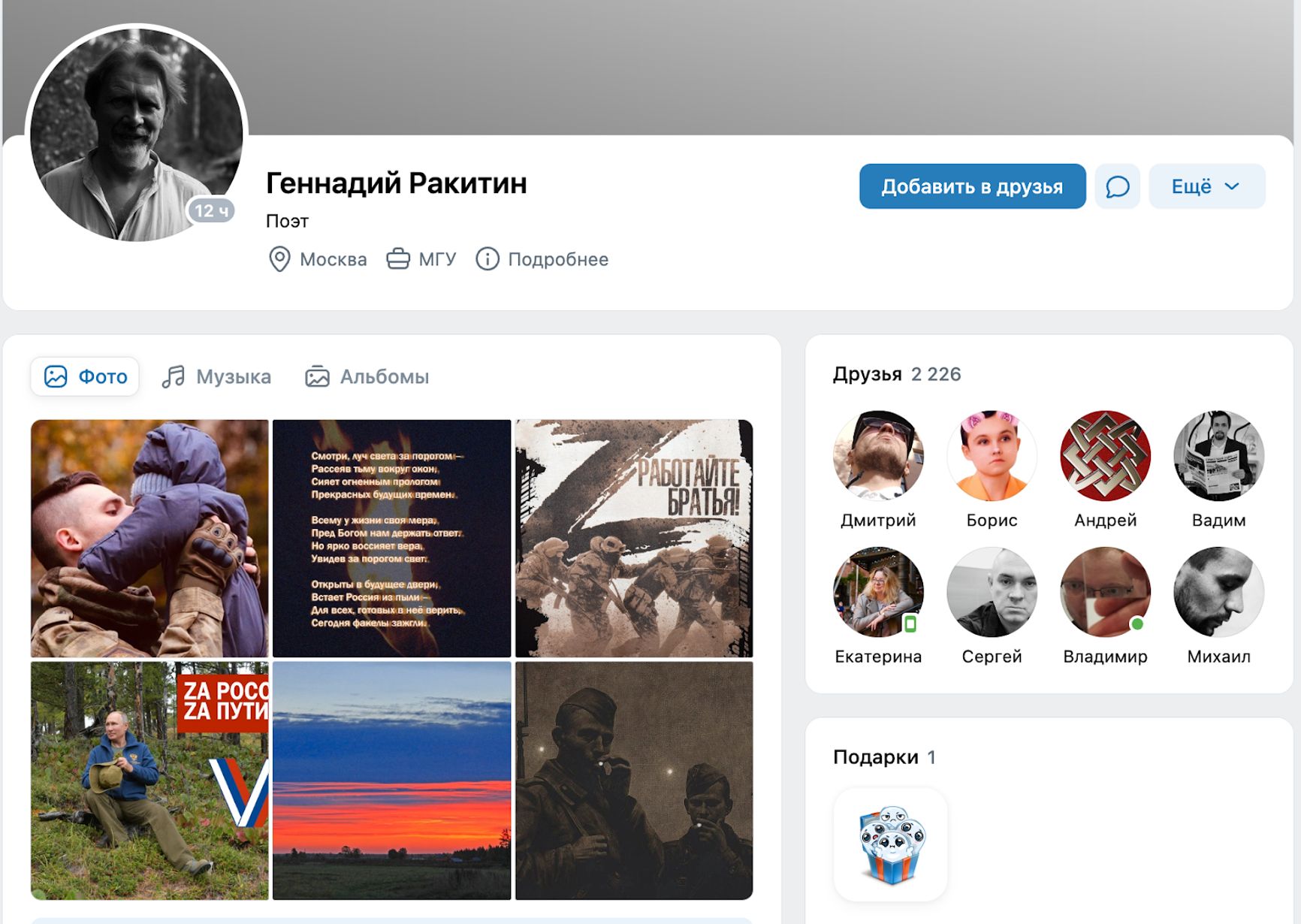 Сотня депутатов Госдумы и еще несколько десятков сенаторов «подружились» в соцсети «ВКонтакте» с фейковым Z-поэтом, который выдавал стихи немецких нацистов за патриотические. На это обратил внимание журналист Андрей Захаров.