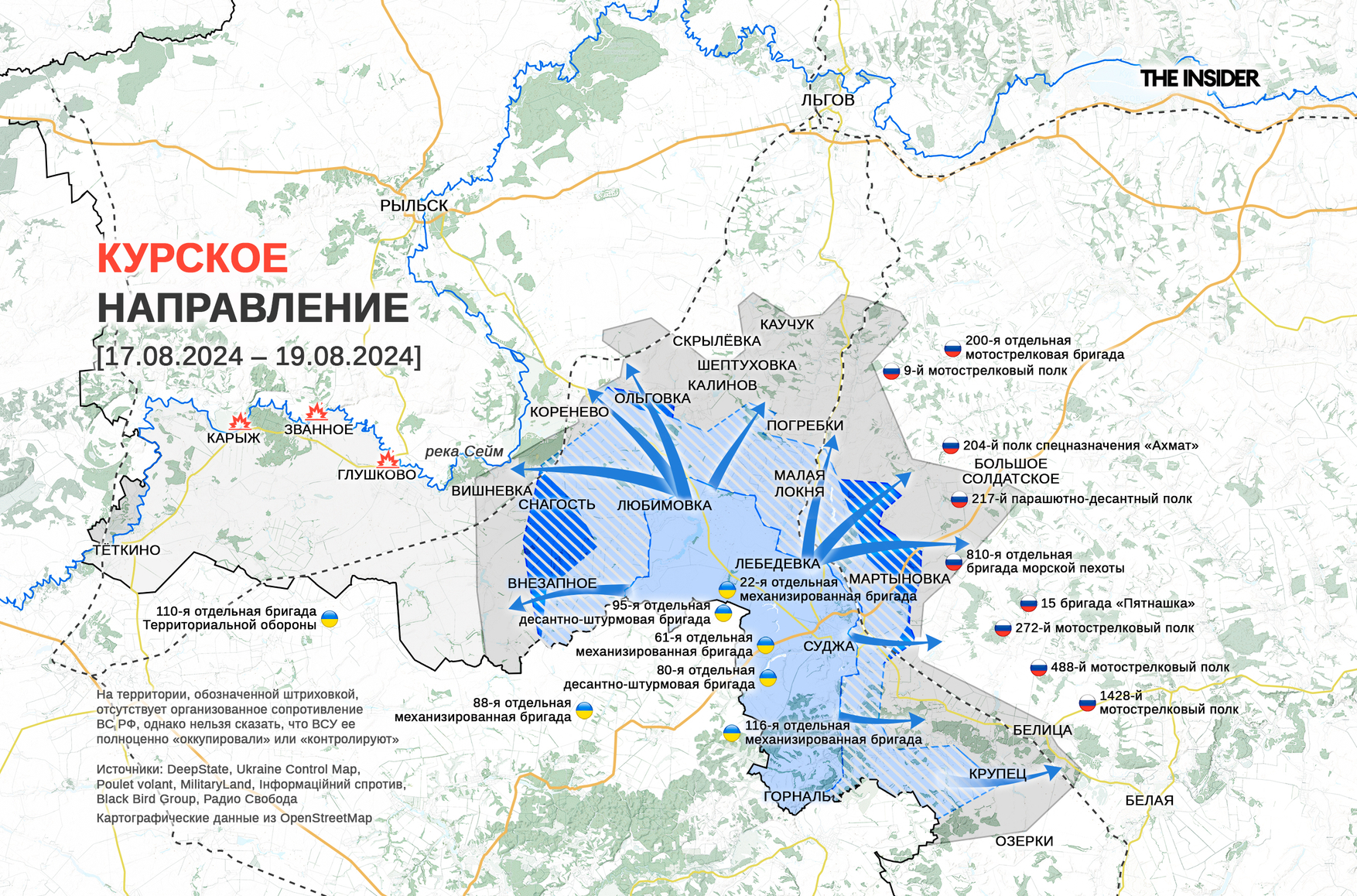 Что касается ситуации рядом с Суджей, то, по словам «военкора» Юрия Котенка, в 10 км от нее в селе Мартыновка, расположенном на дороге в сторону Курска, идут «ожесточенные бои» с применением бронетехники, реактивной и ствольной артиллерии. В то же время другой «военкор», Роман Сапоньков, сообщает, что от села Большое Солдатское до противника — около 5 км, а это значит, что украинские подразделения продвинулись дальше Мартыновки (между Мартыновкой и Большим Солдатским по трассе — более 10 км).
