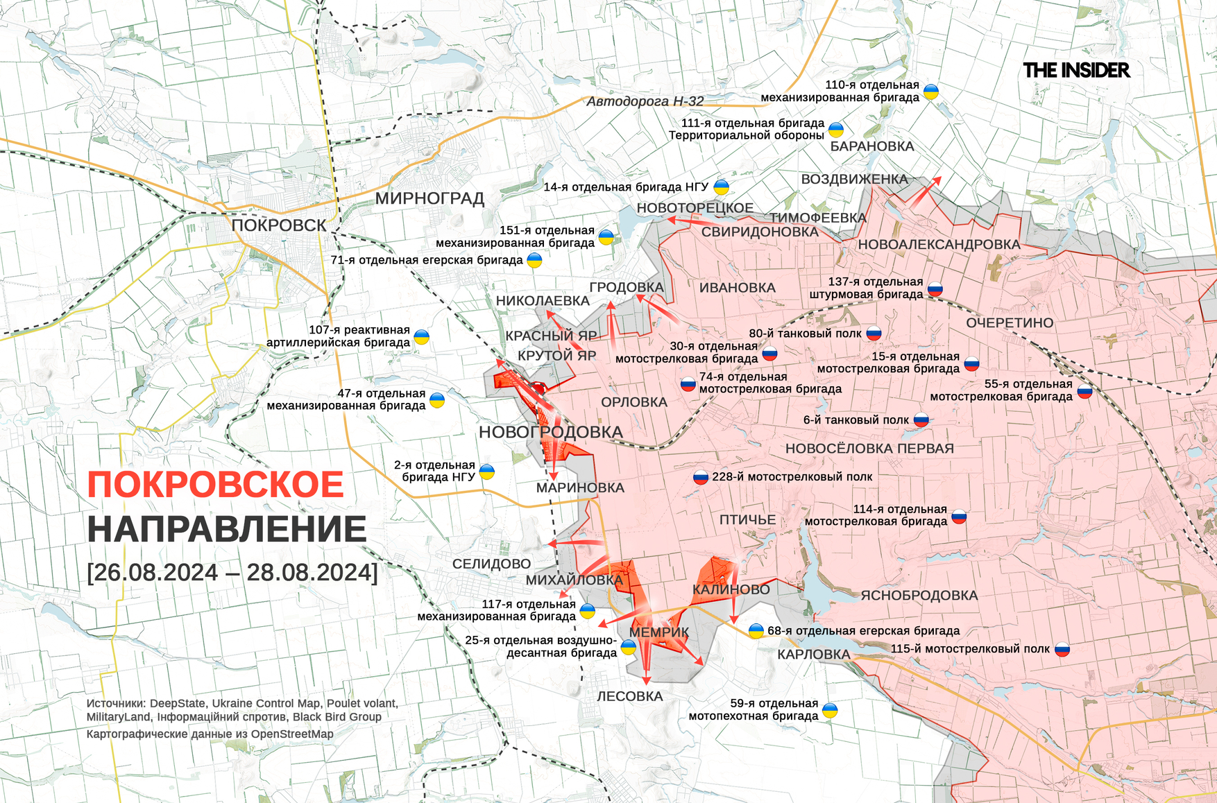 DeepState подтверждает потерю Калиново и Мемрика и практически полный захват Новогродовки — по сведениям аналитиков проекта, бои продолжаются только на северной окраине. Они также отмечают продвижение ВС РФ в Новогродовке, Константиновке, а также около Михайловки, Лесовки и Водяного. «Освобождение» села Мемрик российские военные отметили «флаговтыком».