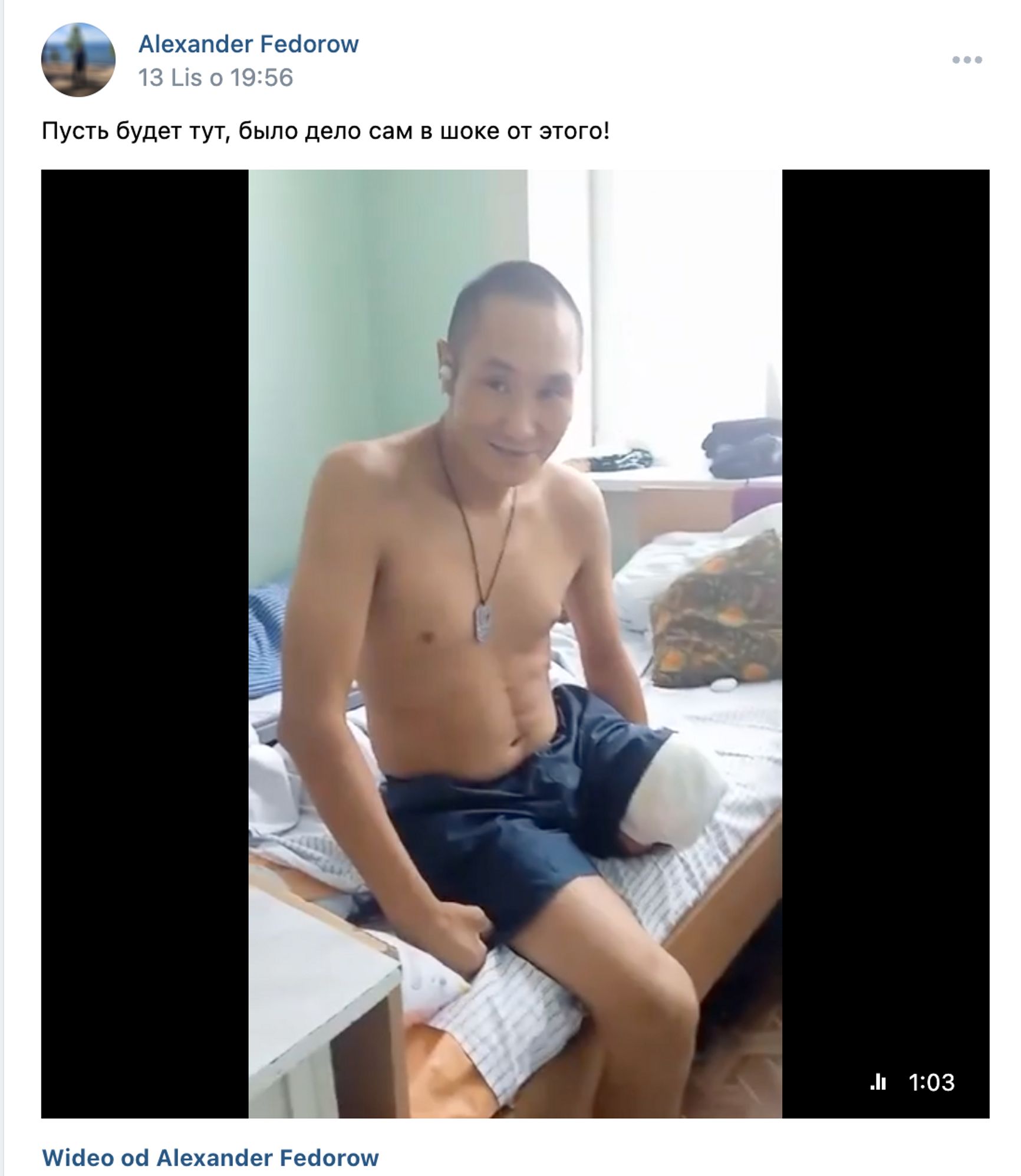 The Insider нашел страницу Федорова в «ВК», вечером 13 ноября на ней было опубликовано разошедшееся в СМИ и Telegram-каналах видео с ним, в описании к нему он пишет: «Пусть будет тут, было дело, сам в шоке от этого!»