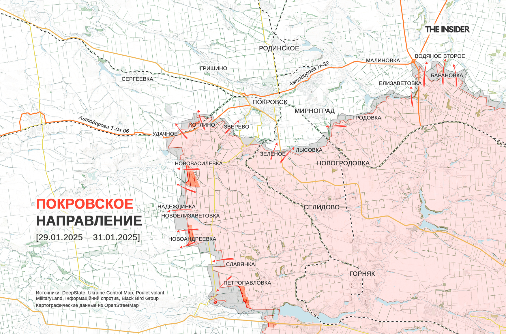 DeepState сообщает о незначительном продвижении ВСУ около Удачного и тактических успехах ВС РФ в Котлине (до 2016 года — Димитрово) на трассе западнее Покровска. Кроме того, аналитики проекта признают захват российскими военными Новоандреевки. В свою очередь, Минобороны РФ отчиталось об «освобождении» населенных пунктов Зелёного, Новоелизаветовки и Нововасилевки.