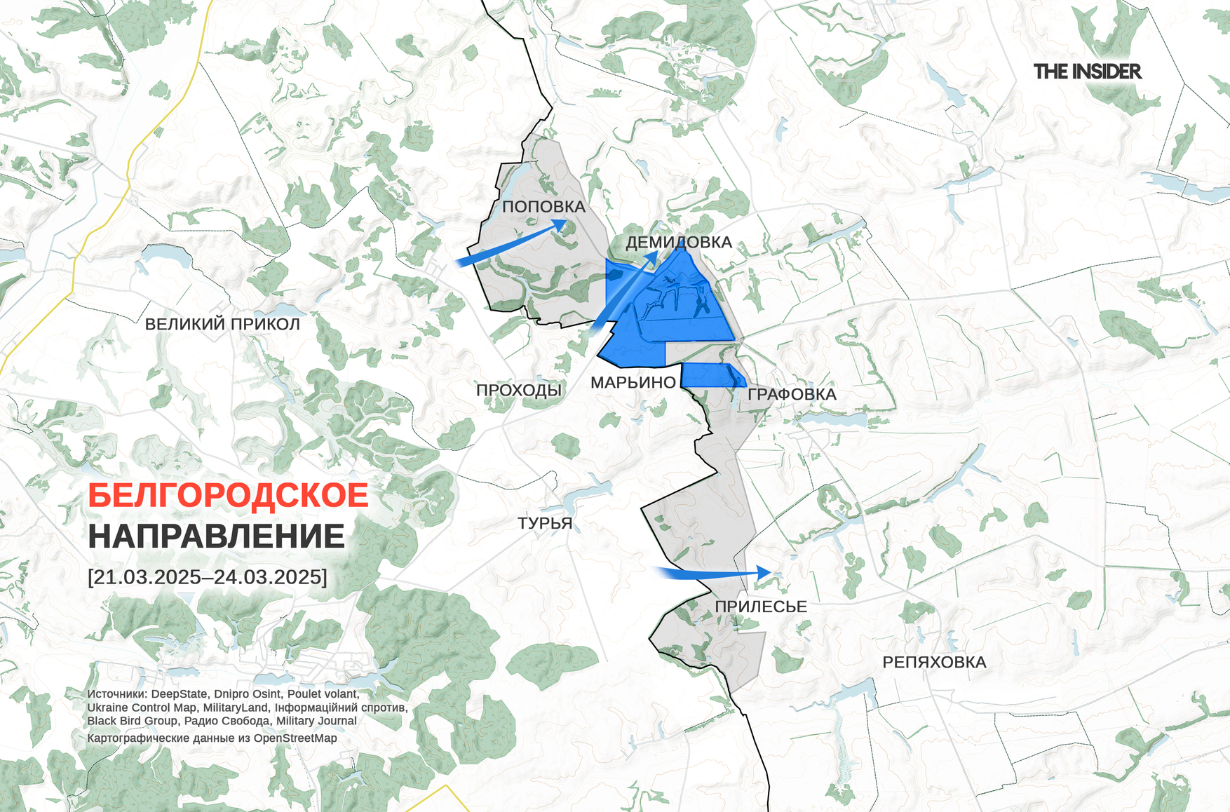 Пророссийский картографический ресурс «DIVGEN 🚩 Карта СВО» помечает Демидовку как «серую зону», а участок от границы до Демидовки — как подконтрольный украинским войскам. Впоследствии Владимир Романов опубликовал видео с беспилотника, который, по его словам, корректирует огонь по украинским бойцам в Демидовке (согласно геолокации The Insider, на втором видео действительно показана центральная часть этого населенного пункта).