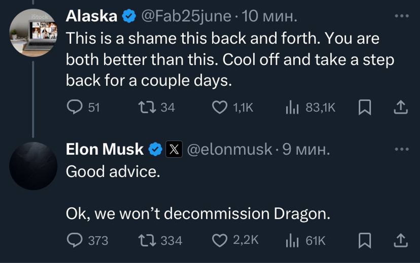 Позже Маск передумал выводить Dragon из эксплуатации. Так он ответил пользователю X, который попросил «остыть и отступить на несколько дней».