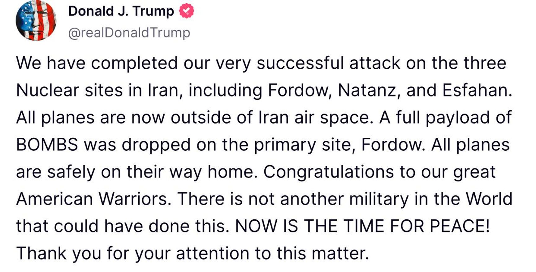 США нанесли удары по трем ядерным объектам в Иране — Фордо, Натанзу и Исфахану, заявил Дональд Трамп. «Полный комплект БОМБ был сброшен на ключевой объект — Фордо». По словам президента, американские самолеты уже покинули воздушное пространство Ирана и направляются обратно в США. «Ни одна другая армия в мире не способна на такое. СЕЙЧАС НАСТАЛО ВРЕМЯ ДЛЯ МИРА!» — добавил он. Трамп поздравил американских военных с успешной операцией. По данным СМИ, Трамп готовится выступить с обращением к нации.
