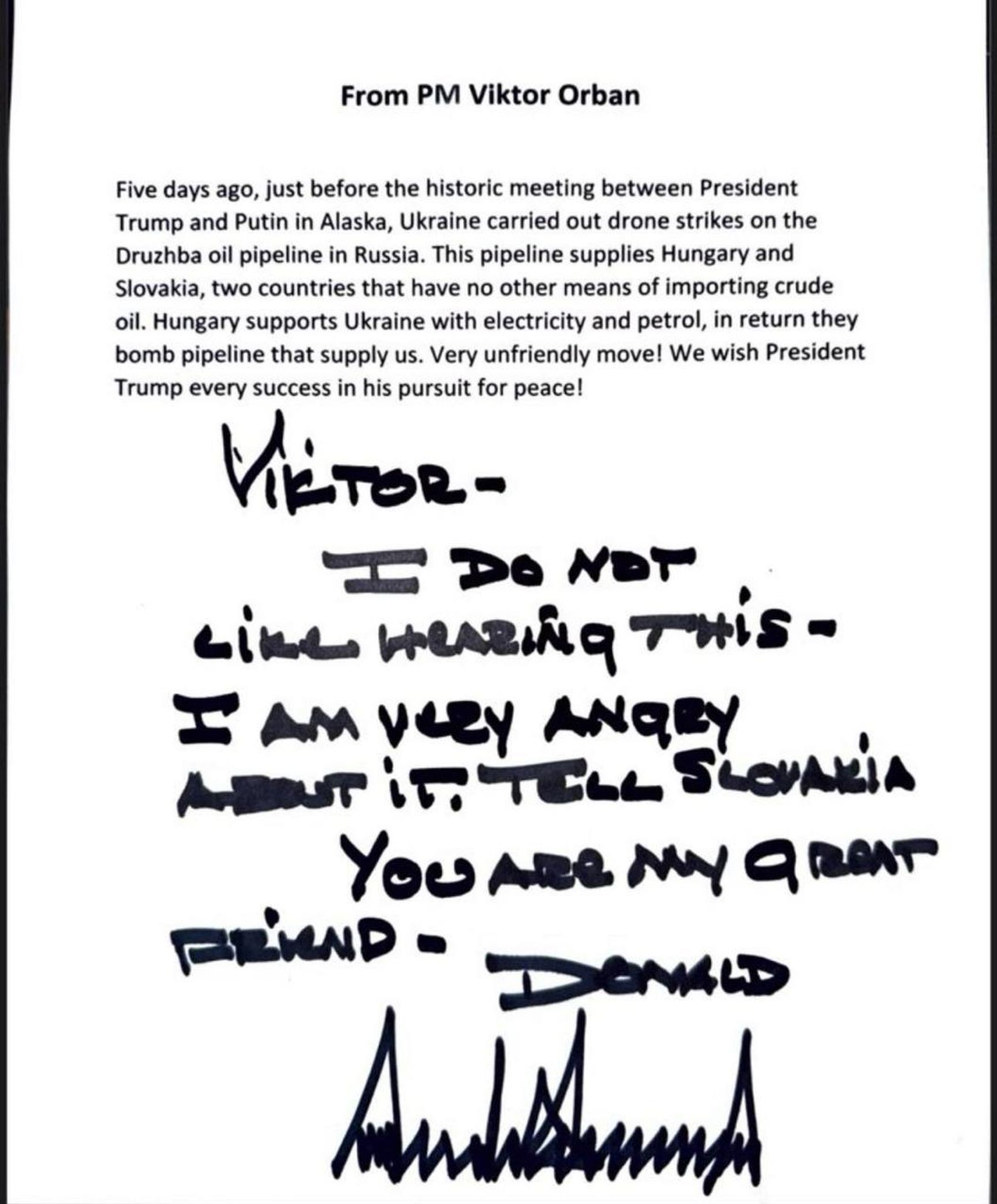 Президент США Дональд Трамп ответил на жалобу премьер-министра Венгрии Виктора Орбана о том, что ВСУ атакуют нефтепровод «Дружба». Партия Орбана «Фидес — Венгерский гражданский союз» на своей странице в Facebook опубликовала скан письма, направленного венгерским премьером в США. Трамп написал свой ответ от руки под текстом жалобы.