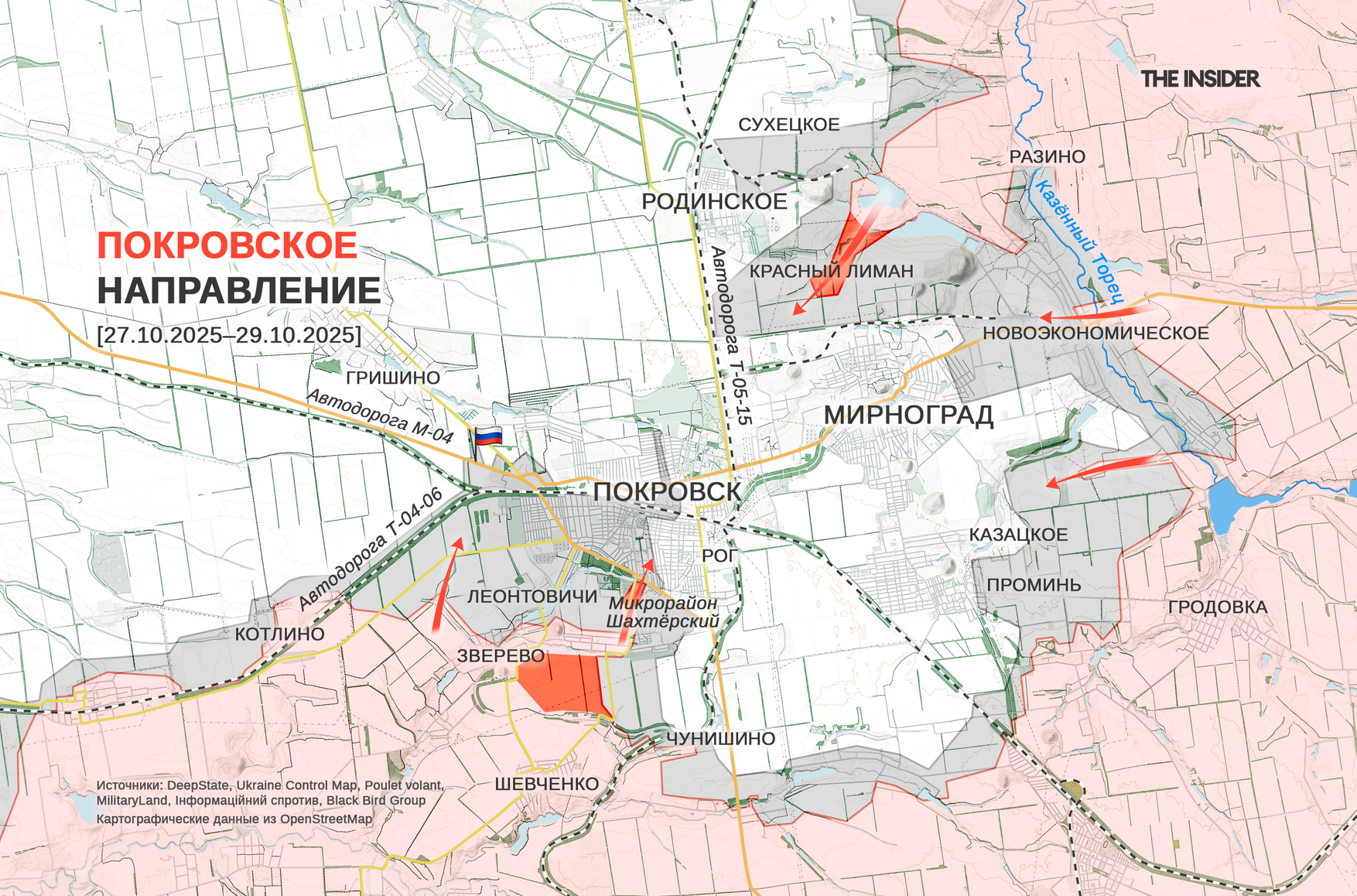 Исследователь под ником Playfra пишет, что ситуация в Покровске продолжает ухудшаться, и город превратился буквально в «серую зону» со смешанными позициями. Он отмечает, что украинским силам необходимо срочно продвинуться к Родинскому с севера, чтобы ослабить давление и срезать российские «клещи» у Красного Лимана. В то же время ВС РФ активно предпринимают действия для закрепления в городе, продолжая «просачиваться» в него малыми штурмовыми группами.