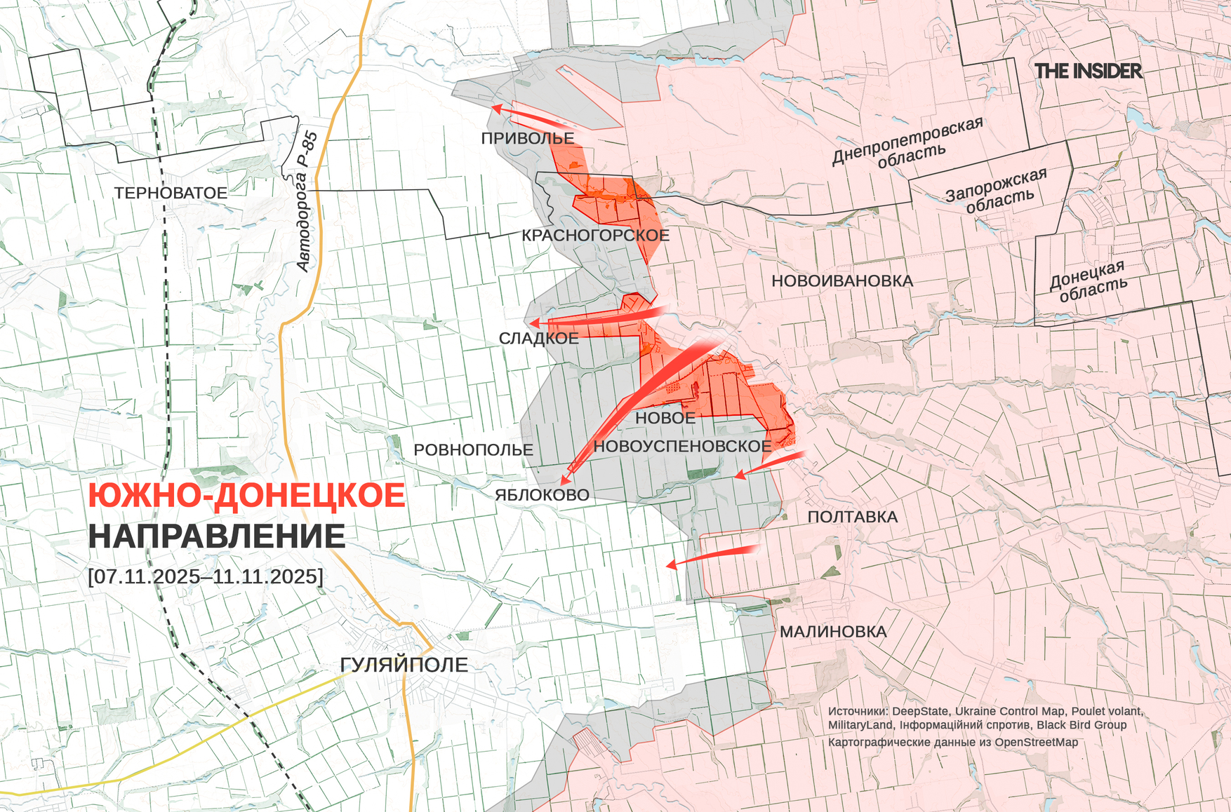 «Военкор» Котенок пишет, что ВС РФ взяли Сладкое и Новое и ведут бои за Ровнополье, Яблоково и Новоуспеновское, а также Орестополь, продвигаясь на Гуляйполе и трассу до Покровского. В DeepState, в свою очередь, зафиксировали продвижение российских войск в районе Сладкого, Нового и Яблокова. В проекте отмечают существенное расширение «серой зоны» на этом участке, обусловленное превосходством ВС РФ в живой силе, и констатируют угрозу городу Гуляйполе с северо-востока.