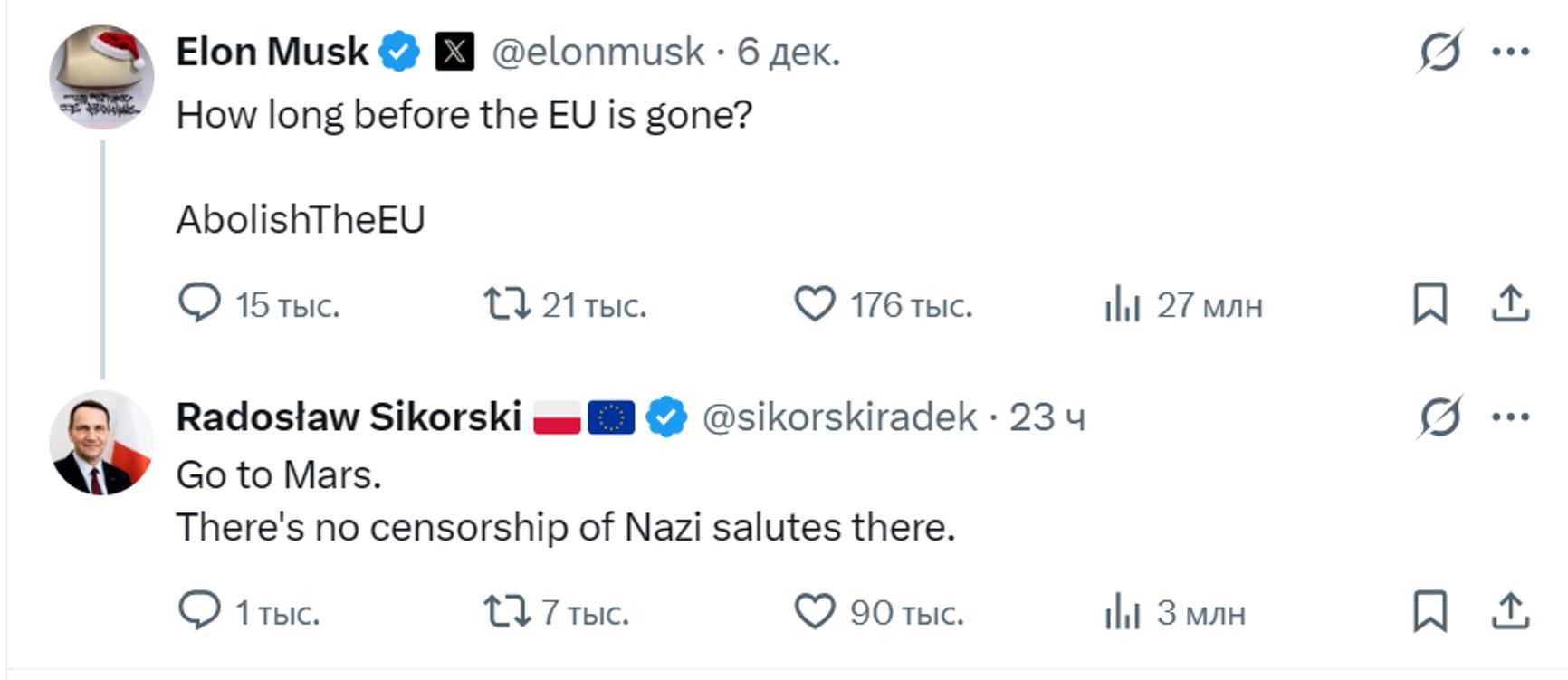 На своей странице в Twitter Маск написал: «Сколько еще времени пройдет, пока ЕС исчезнет? Отмените ЕС». Сикорский ему ответил: «Отправляйся на Марс. Там можно показывать нацистский салют без цензуры».