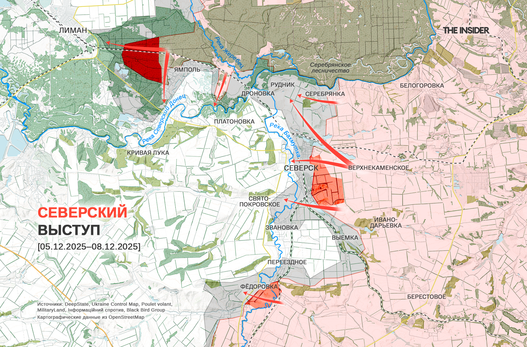 В DeepState констатировали продвижение ВС РФ в районе Северска и в Фёдоровке к югу от города. Украинский OSINT-канал «УКРОККУПАНТ» привязал к местности кадры уничтожения российского флага на здании школы № 1 в Северске с помощью FPV-дрона и сделал вывод, что вся территория города к востоку от реки Бахмутка находится в «серой зоне». Как сообщает «военкор» Котенок, ВС РФ захватили больше половины Северска и продвигаются в Свято-Покровском (до 2016 года — Кирово), к юго-западу от города.