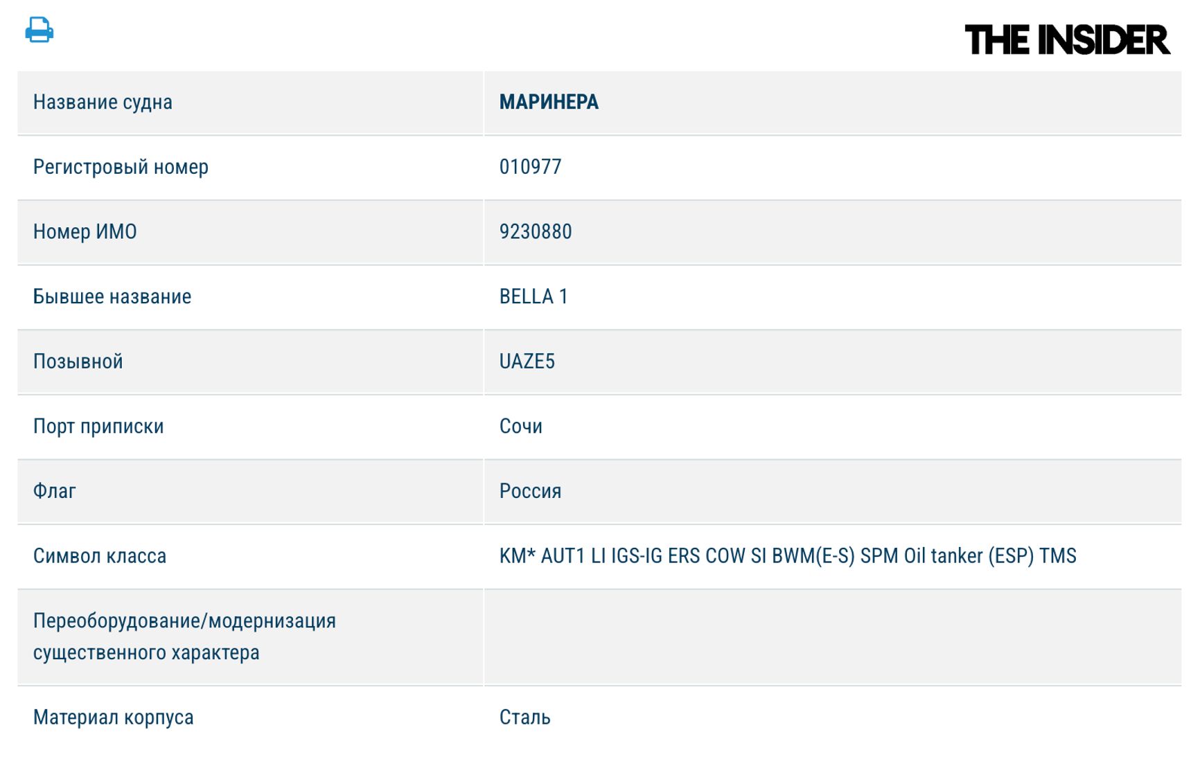 Согласно данным Российского морского регистра судоходства, судно, ранее известное как Bella 1 (IMO: 9230880), теперь зарегистрировано под названием Marinera. В реестре указано, что танкер ходит под российским флагом, а его порт приписки — Сочи.