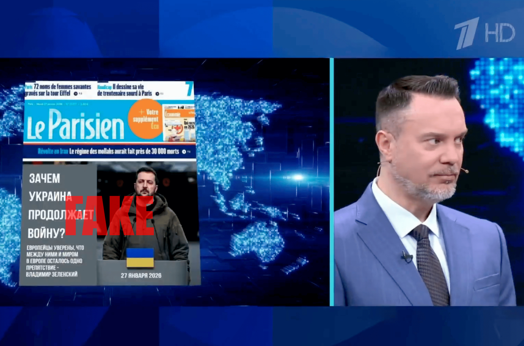 На Первом канале впервые показали фейковые обложки французских газет с критикой Зеленского, созданные бот-сетью «Матрёшка»