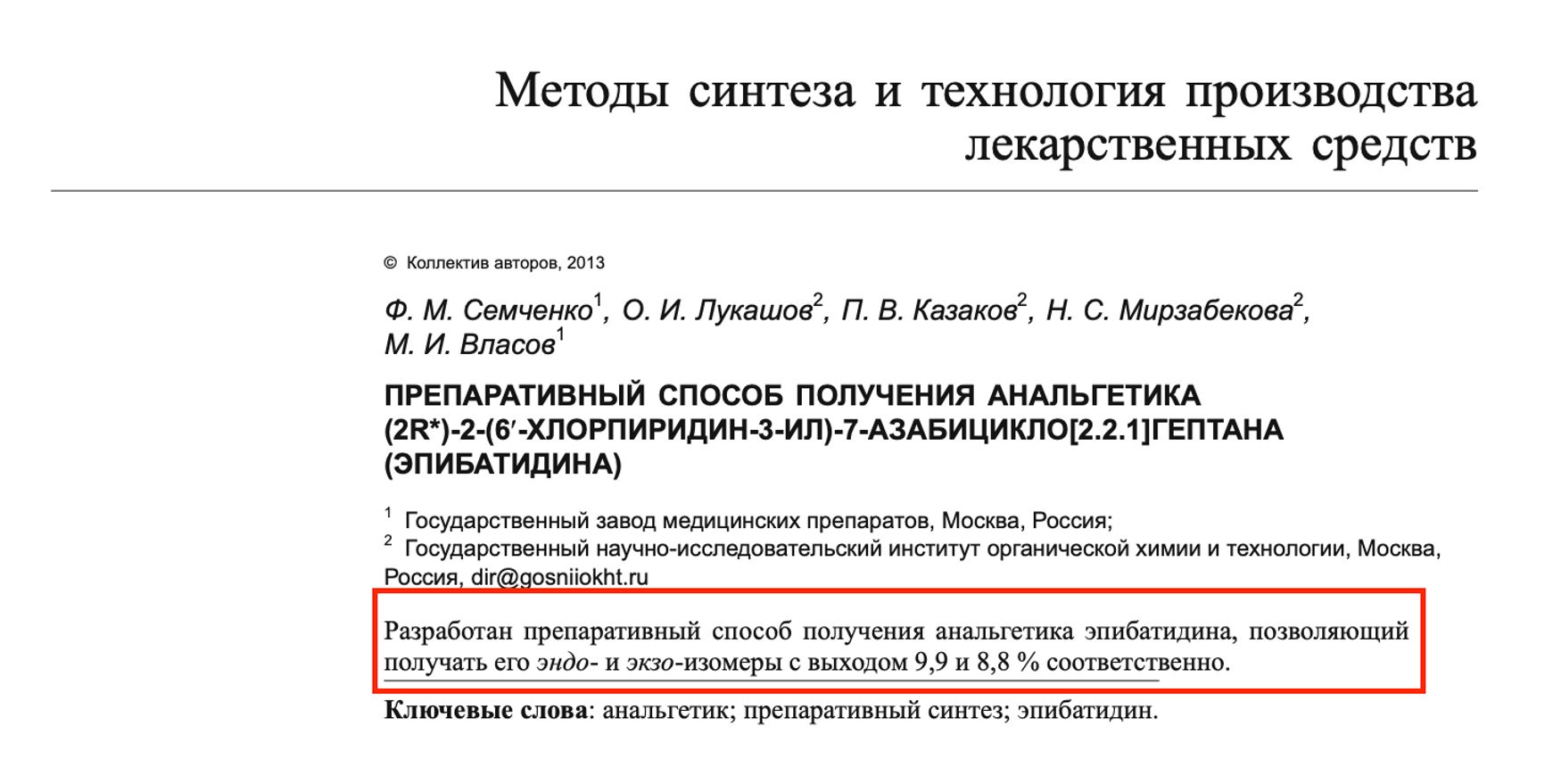 В шапке работы указано, что «разработан препаративный способ получения анальгетика эпибатидина».