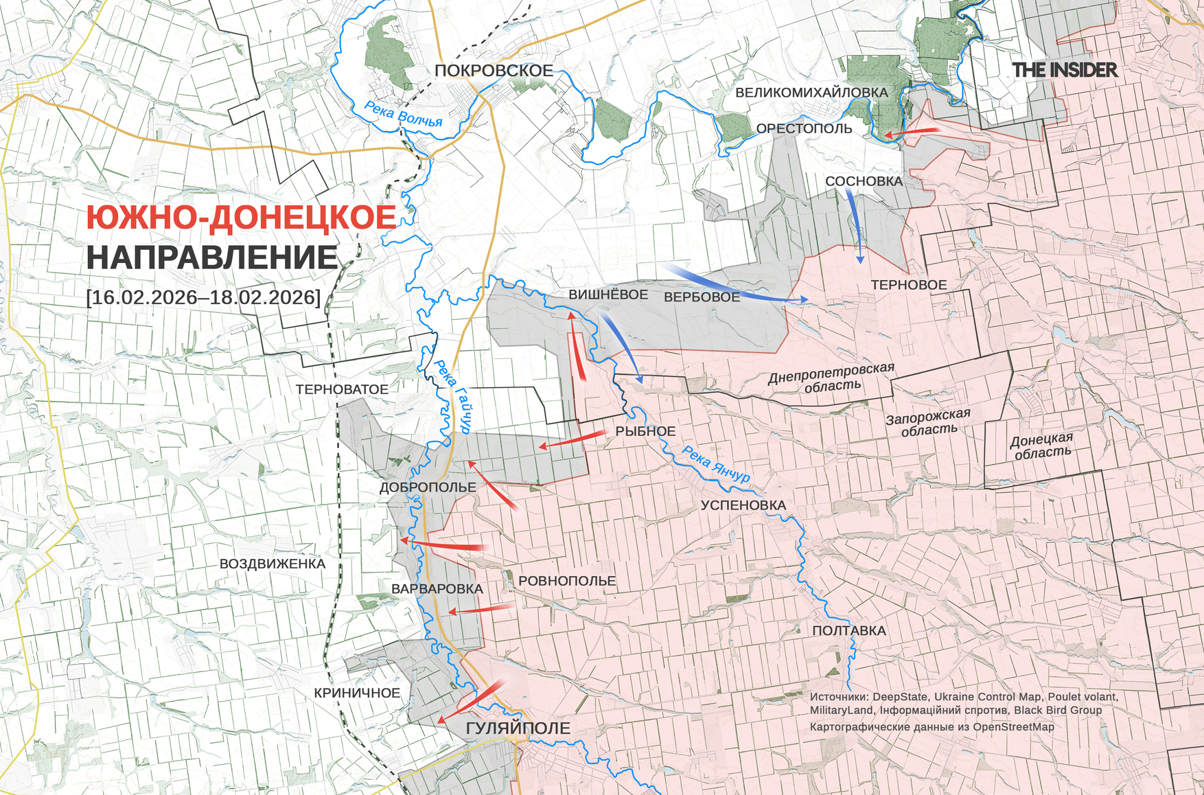 Украинский OSINT-проект «Око Гора ✙ Новости и аналитика» подсчитал на основе карты DeepState, что за прошедшую неделю с 9 по 15 февраля российские войска оккупировали 30 кв. км территории Украины, продвигаясь в среднем по 4 кв. км в сутки. Неделей ранее темпы продвижения составляли 9 кв. км в сутки, еще за неделю до этого — 13 кв. км в сутки. Количество боестолкновений снизилось на 10% по сравнению с предыдущей неделей, составив в среднем 122 в день, свидетельствуют подсчеты того же ресурса на основе сводок Генштаба ВСУ.