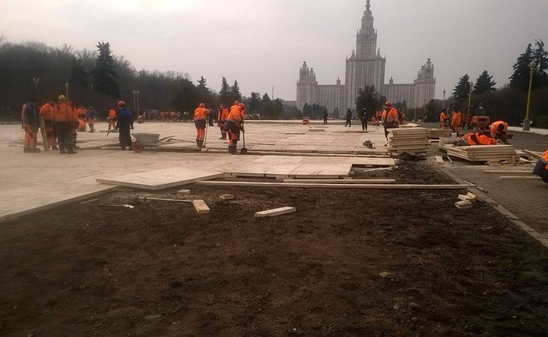 Большой цветник перед главным зданием МГУ на Воробьевых горах застелили фанерой в рамках подготовки к концерту в честь присоединения Крыма. Фотографии выложенного деревянным настилом цветника появились в соцсетях.