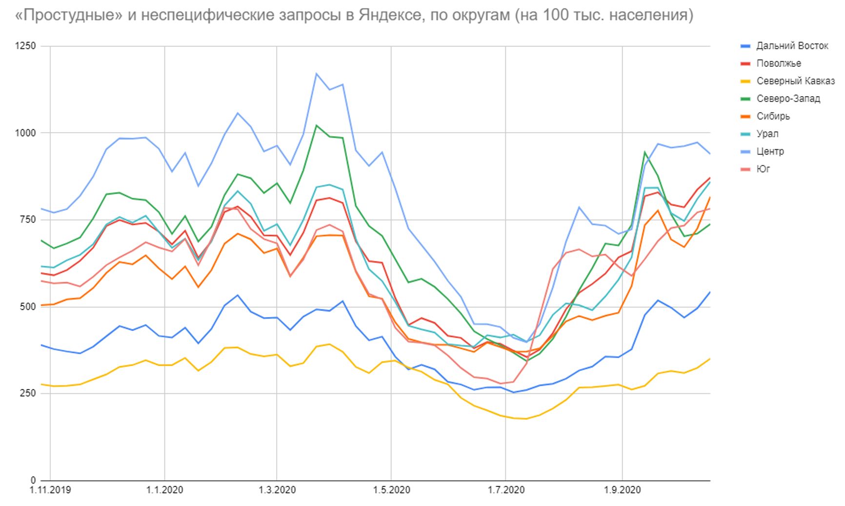 Тяжелее всего ситуация на юге, который обошёлся весной и летом без эпидемии (за исключением Астраханской области, где летний пик пришёлся на август). Худшая динамика — в Сибири, где в большинстве регионов запросы прибавляют по 70−100% уже несколько недель. На Урале, в Поволжье и в ЦФО ситуация схожая: все три округа растут синхронно (и нигде не осталось ни одного региона, где сейчас всё было бы спокойно).