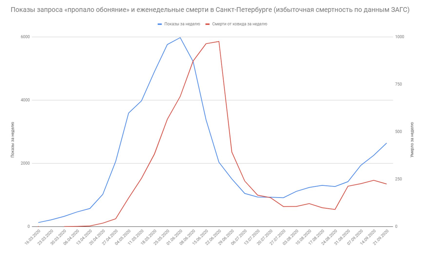 Сильную корреляцию между запросами и смертностью показывает и Петербург. Ниже — сопоставление запросов и смертей от ковида, высчитанных как 90% от избыточной смертности за конкретный месяц (именно эта оценка звучала в мае-июне в Петербурге; по Москве с ковидом ежемесячно соотносят от 90 до 100% избыточных смертей).