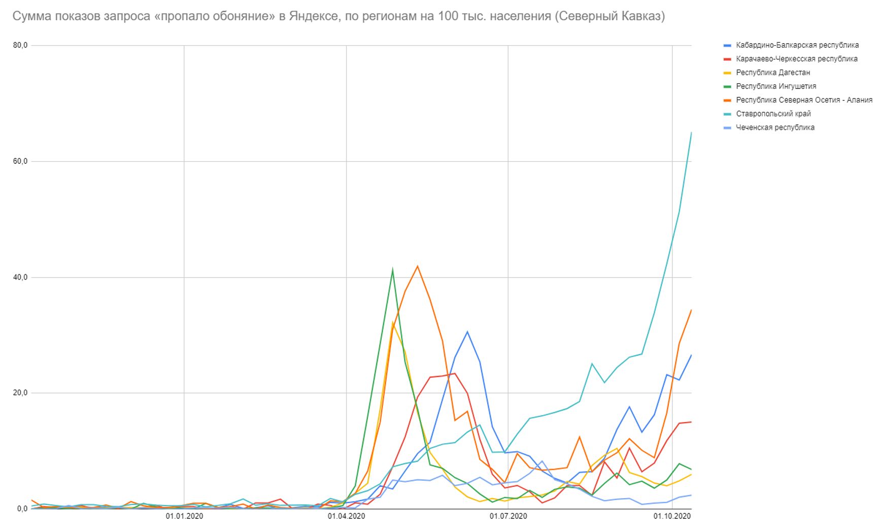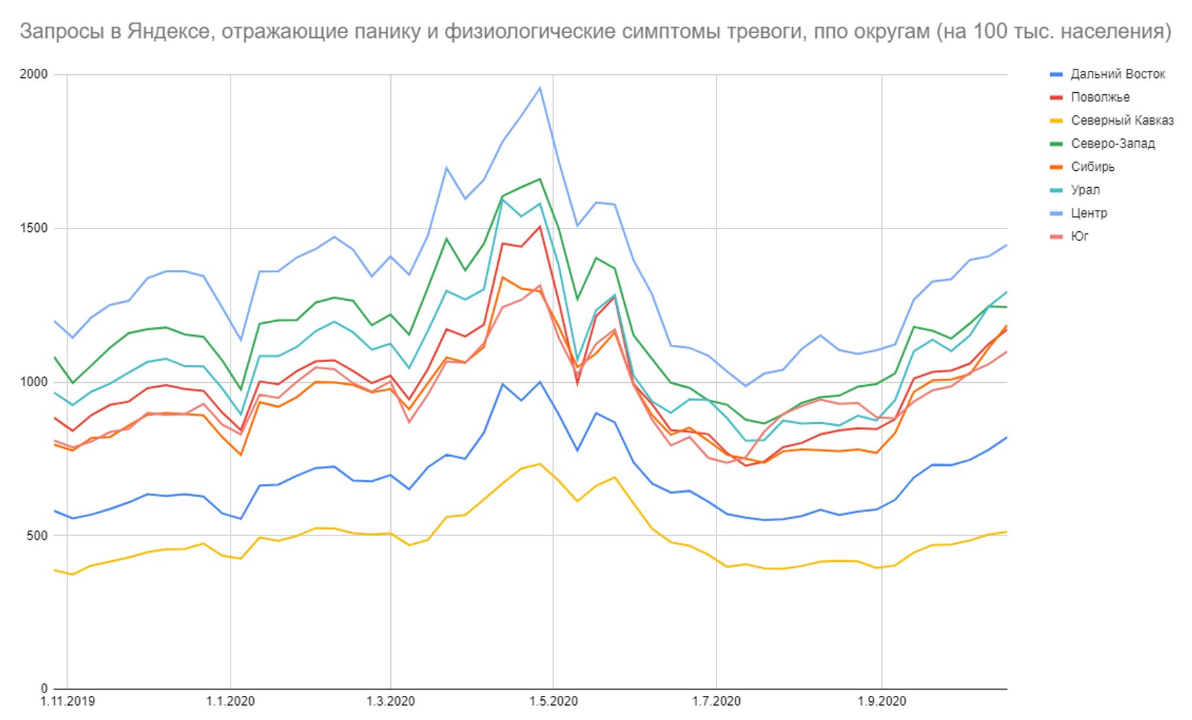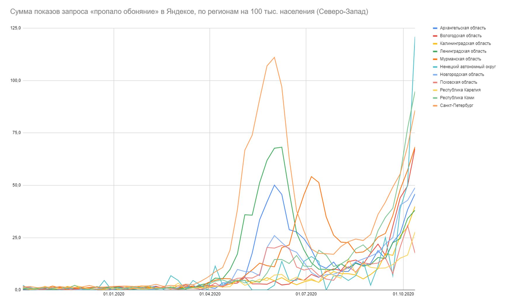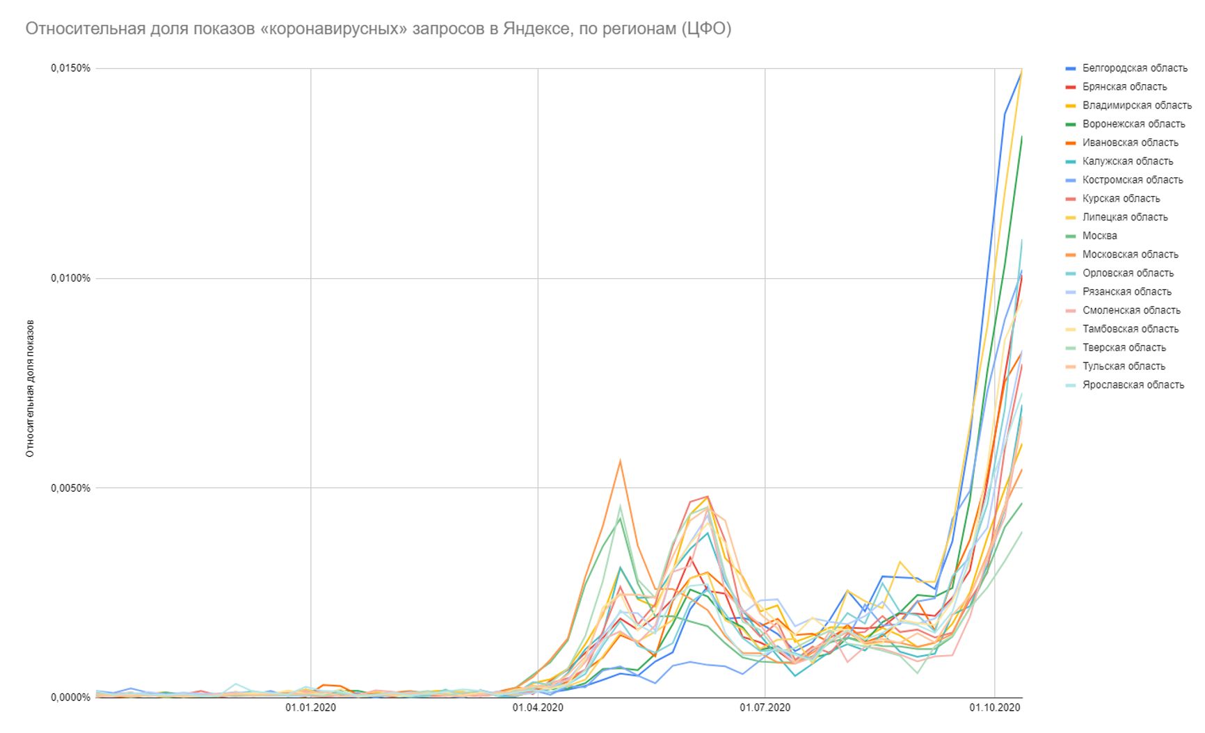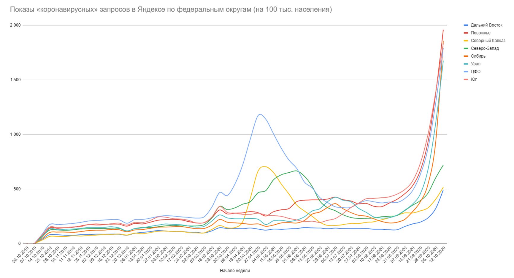 Если оценивать относительную долю показов (сколько % приходилось на конкретный запрос от всех запросов в Яндексе в регионе за период), картина ещё страшнее — в 6 регионах ситуация вдвое хуже, чем в Москве на майском пике, ещё в 3 — ситуациях втрое хуже, остальные регионы уже преодолели весенне-летние пики — и свои, и московский: