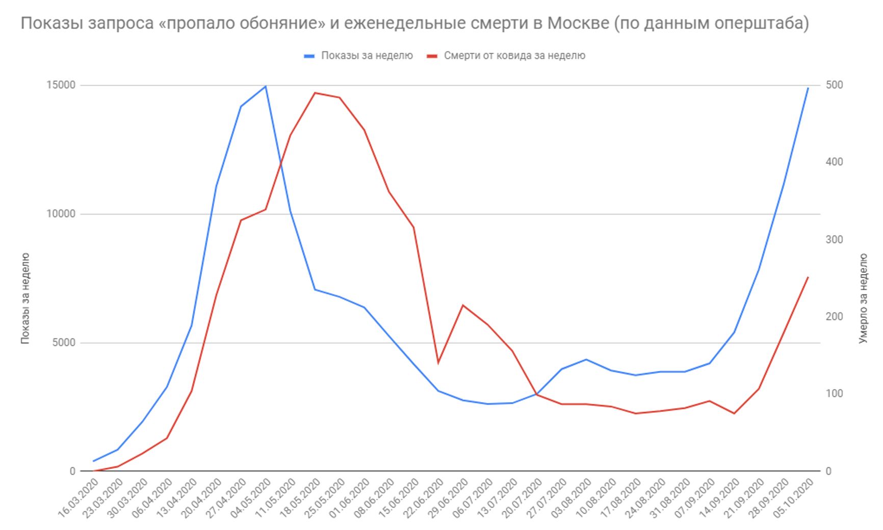 Как это выглядит на практике? Вот Москва. Сопоставление запросов и смертей за неделю. Здесь видно, как смерти следуют за запросами с двухнедельным сдвигом. А ещё видно, как с августа смерти перестают отражать динамику запросов.