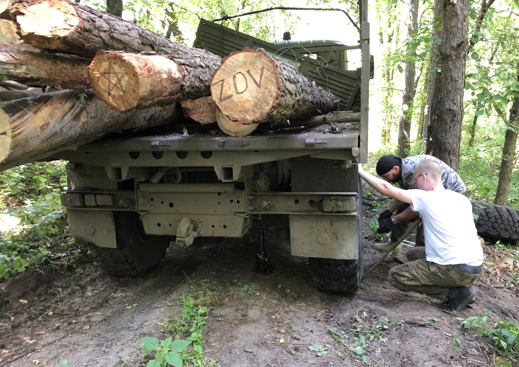 После обеда уже загруженные в машины брёвна расписывают звездочками, литерами Z и V, пишут благодарности и пожелания победы. Рисовать на бревнах особенно любят дети. Патриотически настроенные родители берут их с собой на рубку леса.