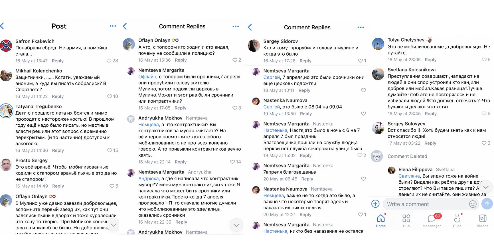 После каждого происшествия, сообщения о краже или приставаниях среди жителей Мулино разгорается спор, какие именно военные виноваты: срочники, контрактники, добровольцы. Все ЧП с участием военных власти скрывают, ограничиваясь в лучшем случае сухими формулировками без деталей. Подробности мулинцы выясняют по чатам или друг у друга.