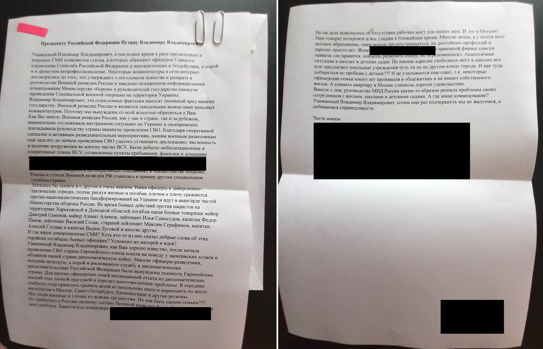 Источник The Insider в Администрации президента, передавший жалобу, закрыл фамилии подписантов, поскольку опасается, что его могут вычислить и посадить за разглашение гостайны. Однако под черными «плашками» указаны 11 офицеров ГРУ, включая заместителя командира части, обещавшего решить проблемы высланным из Европы персонам нон грата, а также супруга офицера, которая сильно оскорбилась на предложение развозить пиццу.