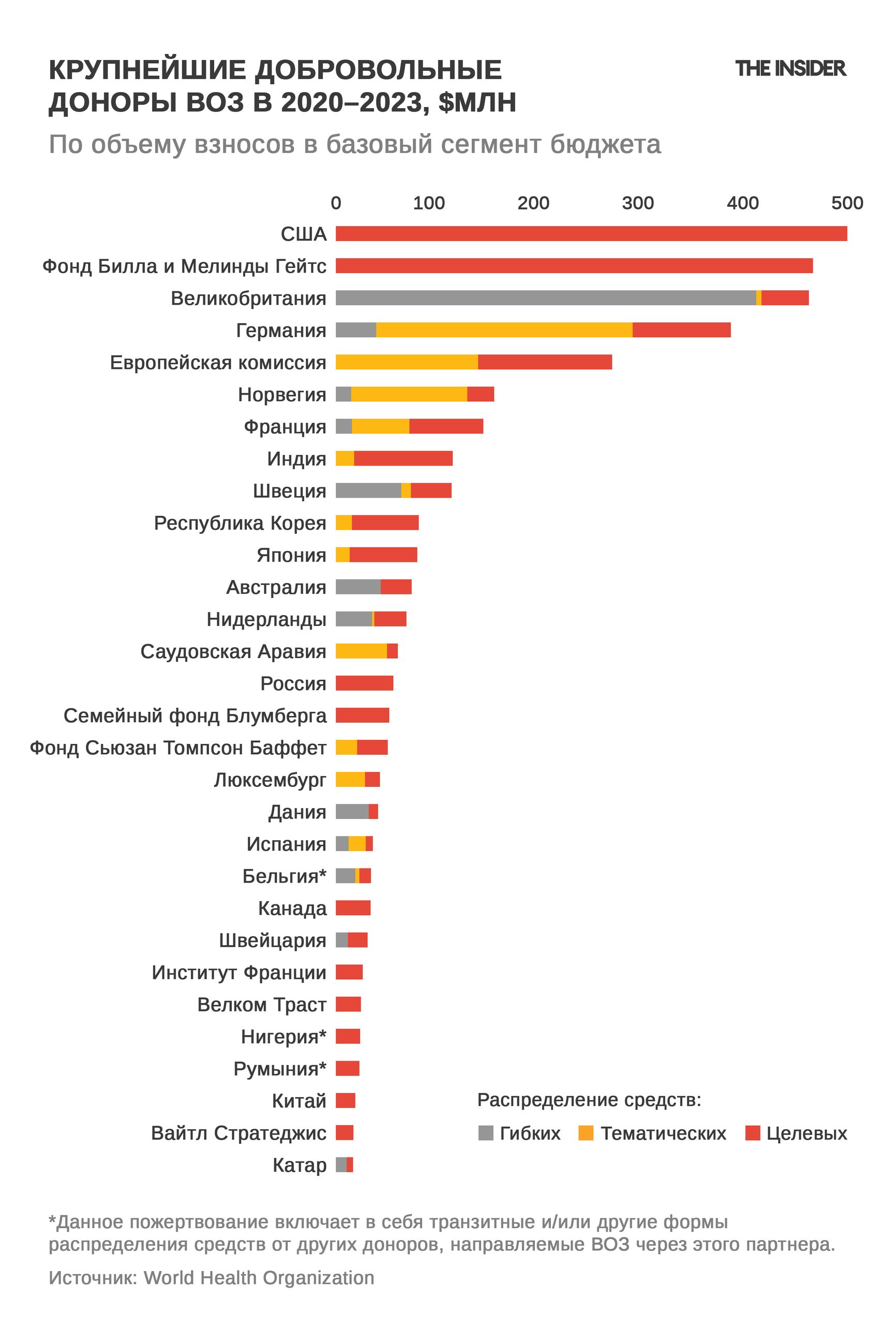Финансирование ВОЗ складывается из обязательных взносов государств-членов и значительной доли добровольных целевых (под определенную задачу) взносов от правительств, фондов и частных партнеров. Когда страны по внутренним политическим причинам задерживают взносы или ограничивают их величину, организации приходится перераспределять средства, задерживая обновление инфраструктуры, наем специалистов и другие процессы.