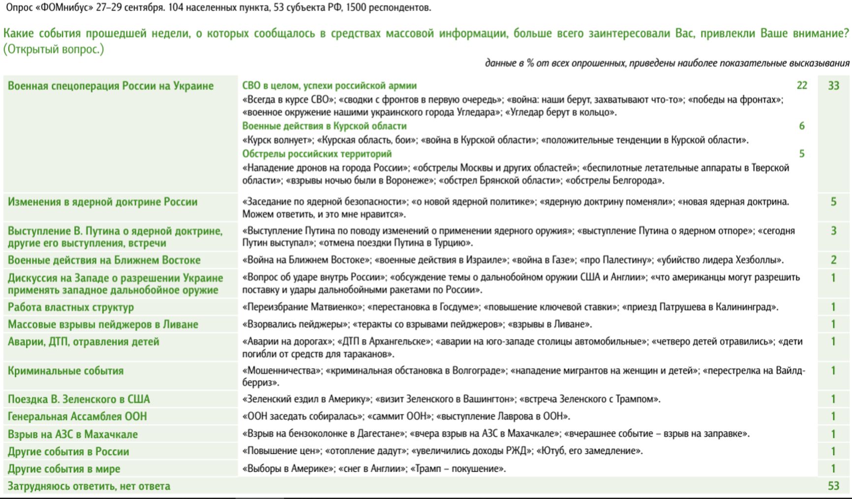 Сказать, что Курск вовсе не взволновал граждан, нельзя, но взволнованность эта носила нестойкий характер. Если в начале августа нападением на Курскую область интересовались 39% опрошенных, то при опросе 13–15 сентября интерес к этой теме проявили лишь 12% респондентов, 27–29 сентября — уже всего 6%. В рейтинге запомнившихся событий Курск повысил внимание к «СВО» в целом, которое в 2024 году стабильно пребывало ниже 25% (18% в конце августа, 22% в конце сентября). В первой половине 2022 года эта цифра составляла 60–70%.