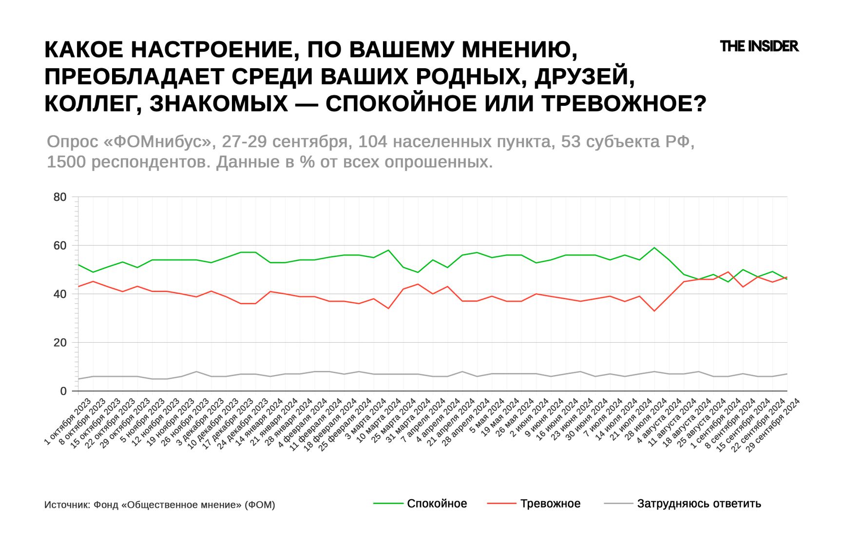 Видно, как в начале «событий» тревожность впервые за много месяцев обогнала спокойствие, но уже 8 сентября спокойствие берет свое («выдохнули»). Однако что-то людей продолжает тревожить: ситуация не разрешается, обещанного выдавливания не видно, и в конце сентября тревожных окружающих, по мнению респондентов, несколько больше, чем спокойных.